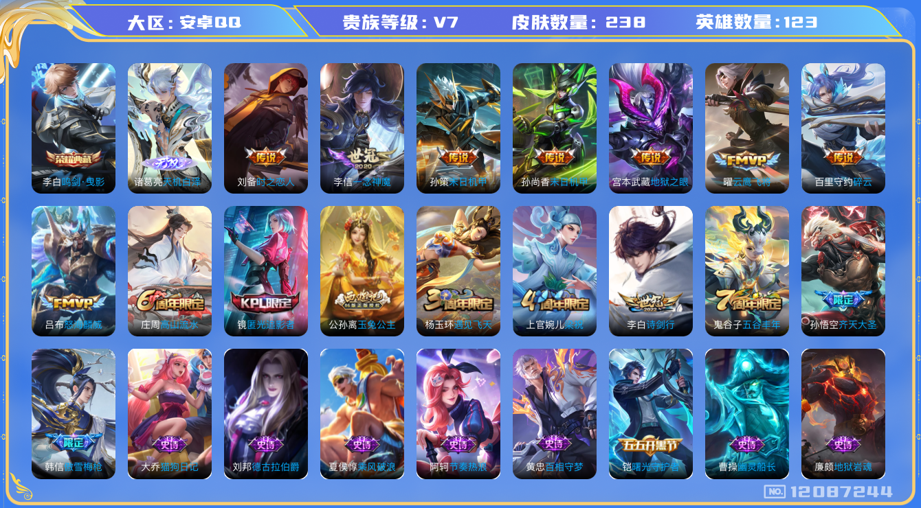 [12087244]V7 1典藏 1无双 10传说 123英雄 238皮肤 可修改实名 优质装备:鸣剑·曳影,天机白泽,云鹰飞将(小将军),一念神魔,末日机甲-孙尚香(绿蚂蚱),地狱之眼,时之恋人-刘备(电焊工),末日机甲-孙策,碎云 珍宝阁皮:妄想食味,胡桃夹子,蔷薇恋人 限定皮:傲雪梅枪,遇见飞天,高山流水,诗剑行,齐天大圣,怒海麟威,五谷丰年,梁祝,匿光追影者,玉兔公主 史诗皮:赞萌露比,星界战将,百相守梦-黄忠,特工魅影,千年之狐,江河有灵,末日机甲-莱西奥,偶像歌手,猫狗日记-孙策,猫狗日记-大乔,时之恋人-孙尚香,节奏热浪,修罗,女仆咖啡,摇滚巨星,水果甜心,天才门将,星夜王子,功夫厨神,德古拉伯爵,暗隐猎兽者,幽灵船长,鬼剑武藏,舞动绿茵,地狱岩魂,纤云弄巧,繁星吟游(呼啦呼啦),拒霜思,缤纷独角兽,乘风破浪,水晶猎龙者,曙光守护者,热力回旋,箭羽风息,金属风暴,圣诞恋歌,鹰眼统帅,魅力维加斯,黎明之约,赏金猎手,奇遇舞章,无心,未来纪元-赵云