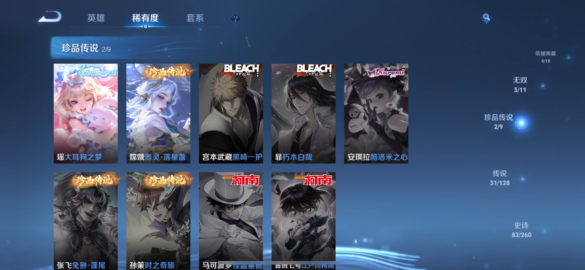 刘邦夺宝奇兵,夏侯惇朔风刀,老夫子醍醐杖,沈梦溪星空之诺,沈梦溪大漠名商,苏烈千军破阵,达摩沙漠行僧,元歌云间偶戏,兰陵王金庭之子,鲁班大师探海日志,明世隐疑决卦,蒙犽狂想玩偶喵,马可波罗暗影游猎,鬼谷子原初探秘者,张良古海寻踪,狄仁杰万华元夜,李元芳银河之约,李元芳云中旅人,弈星混沌棋,钟馗驱傩正仪