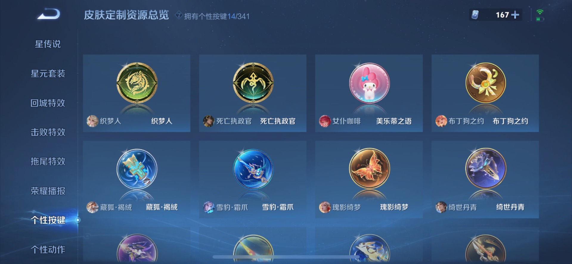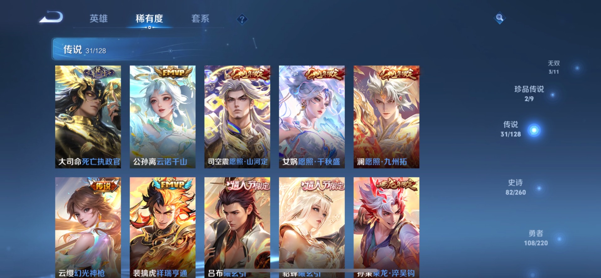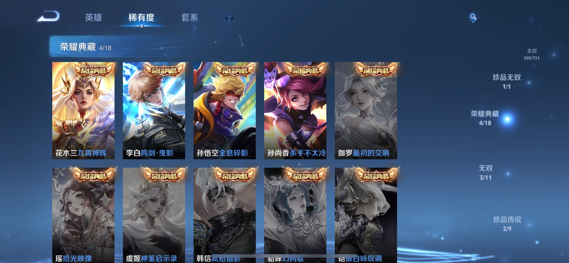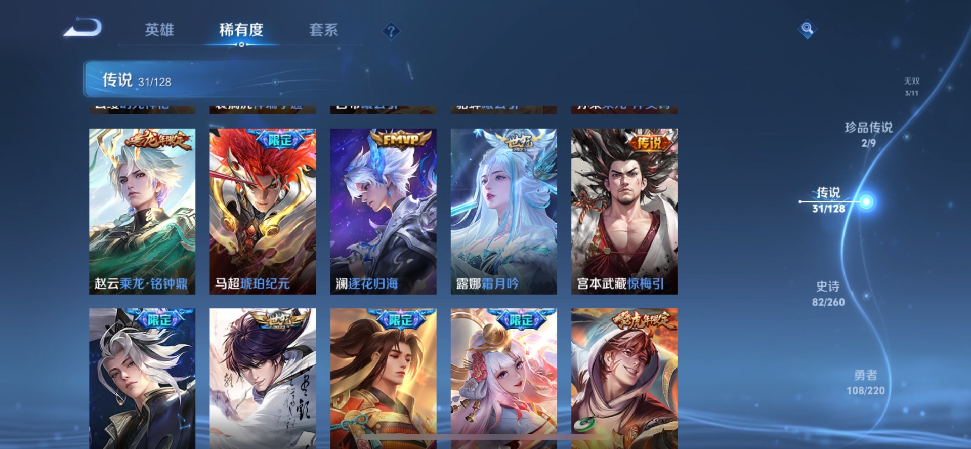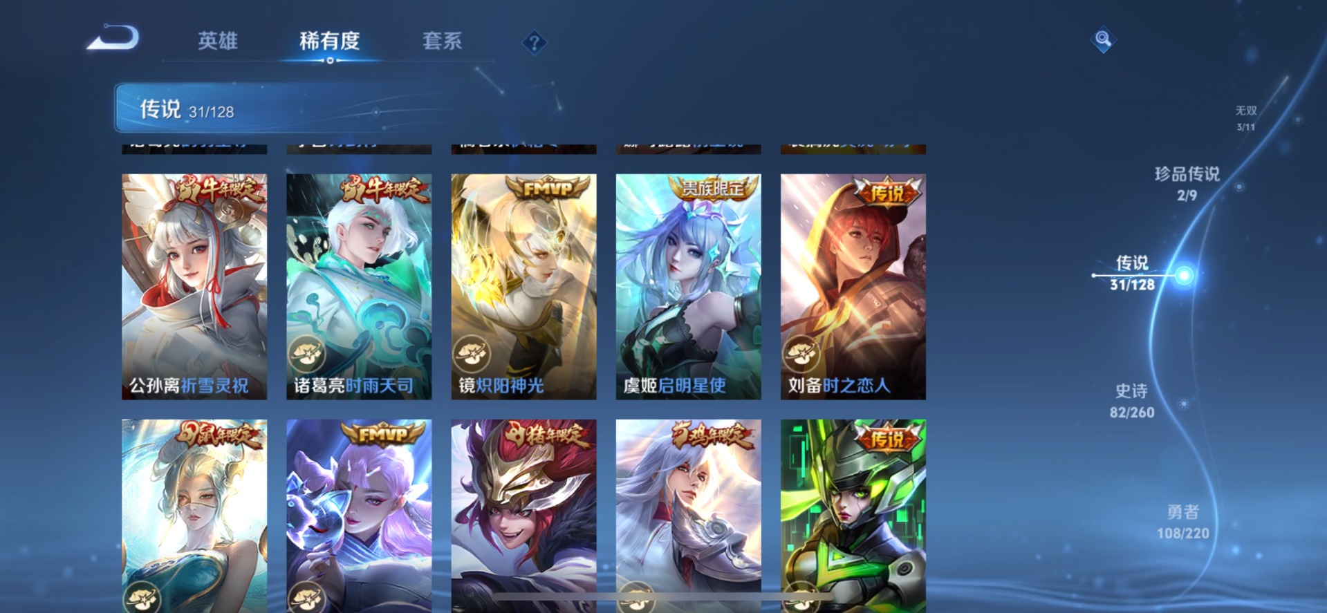 甄姬幽恒,铠青龙志,伽罗太华,后羿如梦令,庄周玄嵩,诸葛亮时雨天司,公孙离祈雪灵祝,司空震愿照·山河定,裴擒虎李小龙,裴擒虎天狼狩猎者,裴擒虎寅虎·赤拳,上官婉儿天狼绘梦者,李白诗剑行,马可波罗山海·玄木吟,女娲愿照·千秋盛,孙悟空大圣娶亲,孙悟空至尊宝,百里玄策白虎志,马超神威,妲己时之彼端,韩信傲雪梅枪,澜愿照·九州拓,娜可露露前尘镜,嫦娥如梦令,王昭君凤凰于飞,橘右京枫霜尽