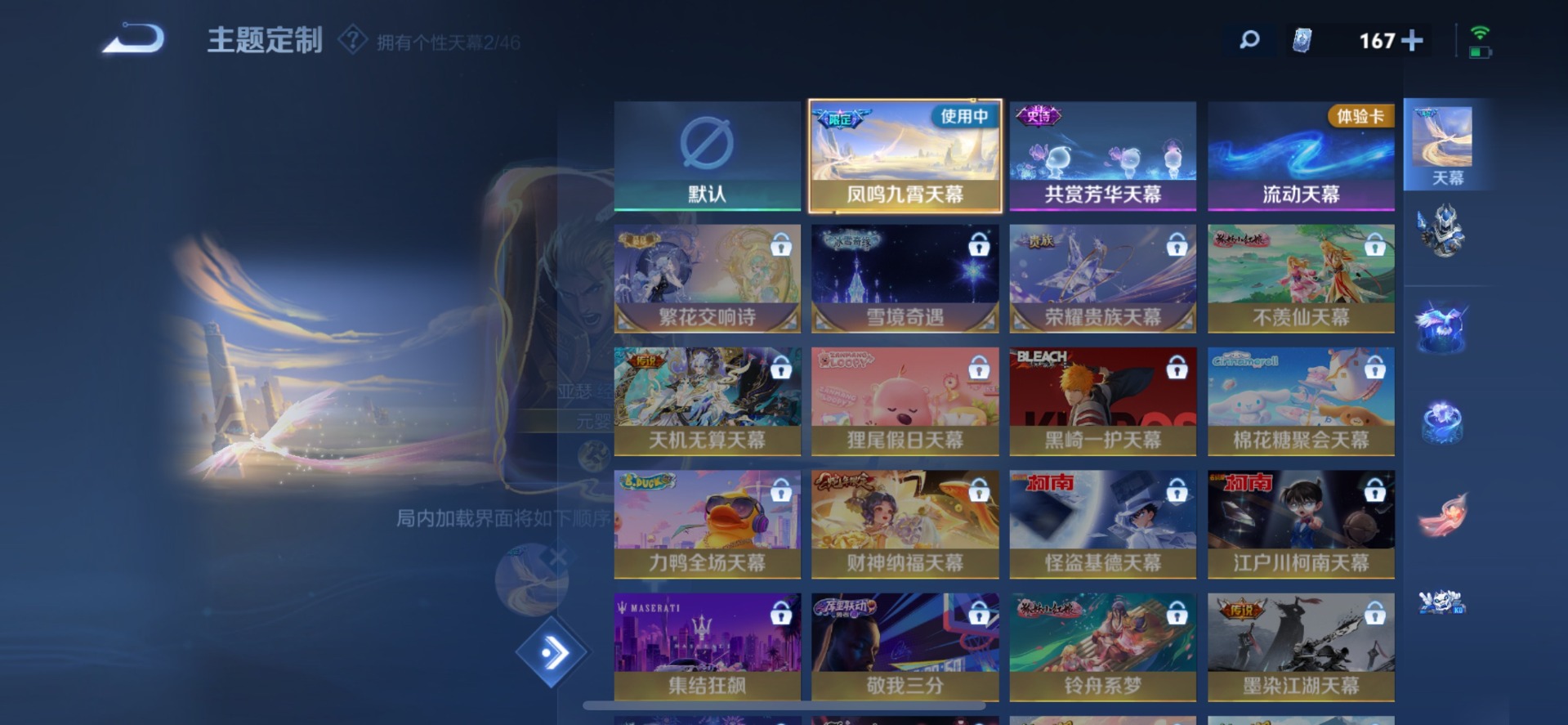 刘备时之恋人,赵云乘龙·铭钟鼎,孙策乘龙·淬吴钩,露娜霜月吟,吕布曦玄引,镜炽阳神光,宫本武藏惊梅引,裴擒虎祥瑞亨通,貂蝉猫影幻舞,马超琥珀纪元,澜逐花归海,貂蝉曦玄引,云缨幻光神枪