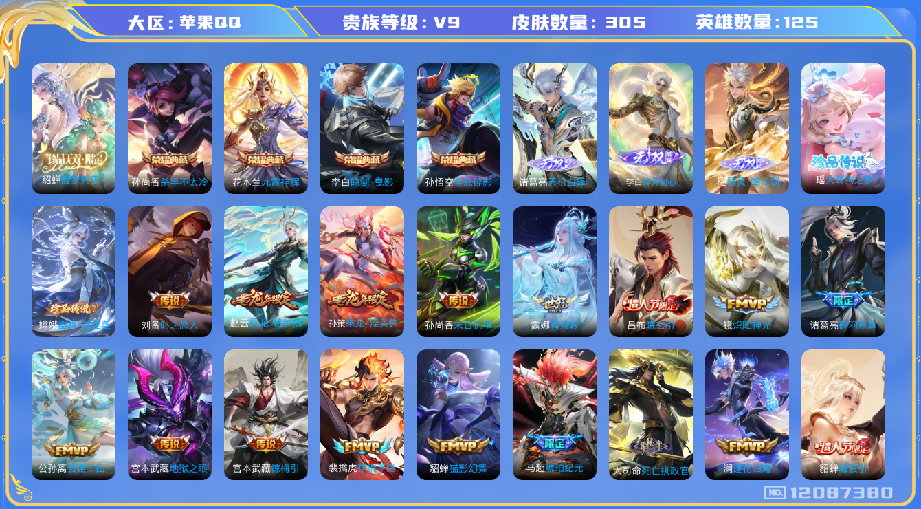 [12087380]V9 4典藏 1珍品无双 3无双 2珍品传说 31传说 125英雄 305皮肤 可修改实名 优质装备:馥梦繁花,杀手不太冷,鸣剑·曳影,全息碎影(猴子典藏),九霄神辉(木兰典藏),碎月剑心(李白无双),器灵·螭龙剑,天机白泽,器灵·落星盏,大耳狗之梦,猫影幻舞,炽阳神光,末日机甲-孙尚香(绿蚂蚱),地狱之眼,时之恋人-刘备(电焊工),鹤羽星尊,惊梅引,霜月吟,澜逐花归海,琥珀纪元马超,涂山容容 传说皮:乘龙·铭钟鼎(赵云年限),乘龙·淬吴钩(孙策年限),貂蝉曦玄引,吕布曦玄引,死亡执政官,云诺千山,祥瑞亨通,幻光神枪 珍宝阁皮:玩趣恶龙 限定皮:愿照·九州拓(澜年限),愿照·山河定(司空震年限),愿照·千秋盛(女娲年限),至尊宝,白虎志(电光耗子),凤求凰(白切鸡),凤凰于飞,太华(伽罗年限),傲雪梅枪,前尘镜,时之彼端,时雨天司(水龙头),神威(电光马子),玄嵩(庄周年限),高山流水,诗剑行,五谷丰年,青龙志(铠年限),幽恒(沐浴露),天狼狩猎者,祈雪灵祝(雪兔子),天狼绘梦者,李小龙,如梦令-嫦娥,如梦令-后羿,大圣娶亲,寅虎·赤拳(老虎年限),枫霜尽,山海·玄木吟(马可年限) 史诗皮:鸭鸭历险记-刘禅,器灵·浮梦炉,糖绘人间,狼魂孤将,绮世丹青,瑰影绮梦,化蝶舞,龙之律动,雪豹·霜爪,藏狐·褐绒,茶境仙,琥珀纪元伽罗,织梦人,遇见神鹿,紫霞仙子,黄金分割率,千年之狐,魅语,百解令(蒙犽),高渐离燃音魔法,无限星赏官,冰冠公主,青蛇,偶像歌手,晚萤,龙骑士(小龙虾),修罗,女仆咖啡,水果甜心,绅士熊喵,天才门将,星夜王子,功夫厨神,德古拉伯爵,暗隐猎兽者,鬼剑武藏,乐园奇幻夜,纤云弄巧,拒霜思,乘风破浪,水晶猎龙者,热力回旋,金属风暴,原初追逐者,鹰眼统帅,王者之锤,暗夜贵公子,魅力维加斯,黎明之约,赏金猎手,无心,未来纪元-赵云