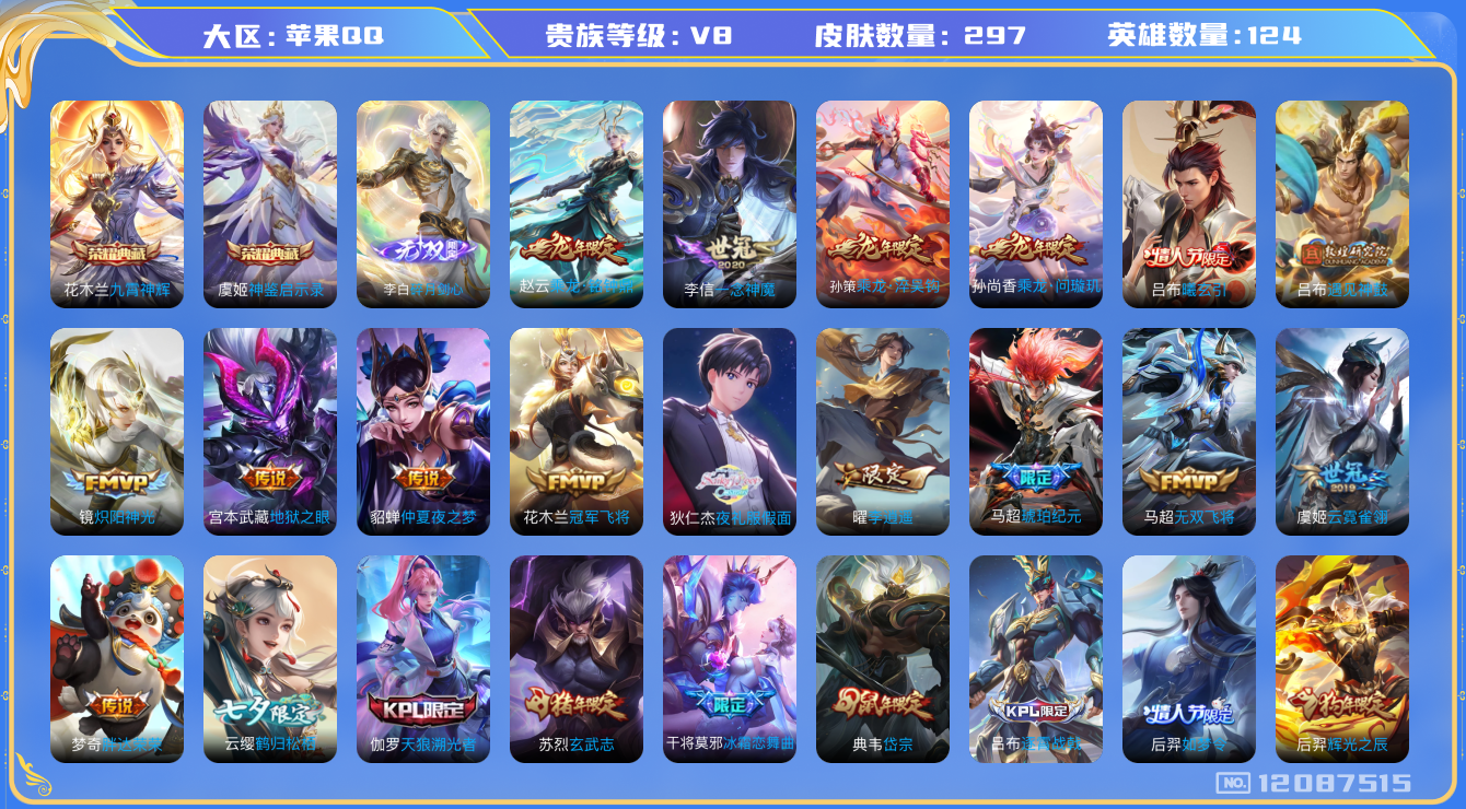 [12087515]V8 2典藏 1无双 24传说 124英雄 297皮肤 女号 可修改实名 优质装备:九霄神辉(木兰典藏),碎月剑心(李白无双),神鉴启示录,冠军飞将,炽阳神光,一念神魔,云霓雀翎,仲夏夜之梦(大飞蛾),地狱之眼,胖达荣荣,李逍遥,无双飞将,鹤归松栖(云缨),遇见神鼓,夜礼服假面,琥珀纪元马超,涂山容容 传说皮:乘龙·问璇玑(孙尚香年限),乘龙·铭钟鼎(赵云年限),乘龙·淬吴钩(孙策年限),吕布曦玄引 珍宝阁皮:妄想食味,女武神 限定皮:愿照·山河定(司空震年限),逐霄战戟,至尊宝,白虎志(电光耗子),时雨天司(水龙头),神威(电光马子),遇见飞天,武圣,梁祝,天狼狩猎者,岱宗(典韦年限),天狼溯光者,李小龙,逐梦之影,玄武志(苏烈年限),辉光之辰,如梦令-后羿,孙行者,大圣娶亲,冰霜恋舞曲,寅虎·心曲(虎婆),玉兔公主,深海之息(深海大菠萝),枫霜尽 史诗皮:鸭鸭历险记-刘禅,化蝶舞,龙之律动,石田雨龙,茶境仙,埋骨钱,蔬乡物语(鲁班七号),乘龙·聚宝船(安琪拉年限),乘龙·忆丹青(大乔年限),紫霞仙子,特工魅影,千年之狐,江河有灵,匿光侦查者,雪夜绮愿(周瑜),百解令(蒙犽),高渐离燃音魔法,蒙恬荣光圣徽,偶像歌手,猫狗日记-孙策,乱世虎臣,节奏热浪,摇滚巨星,水果甜心,绅士熊喵,天才门将,星夜王子,心灵骇客,功夫厨神,德古拉伯爵,暗隐猎兽者,幽灵船长,鬼剑武藏,乐园奇幻夜,天秀·启明,舞动绿茵,地狱岩魂,纤云弄巧,繁星吟游(呼啦呼啦),拒霜思,缤纷独角兽,乘风破浪,逐浪之夏,月团寄思,水晶猎龙者,箭羽风息,原初追逐者,圣诞狂欢,圣诞恋歌,鹰眼统帅,黎明之约,无心,未来纪元-赵云