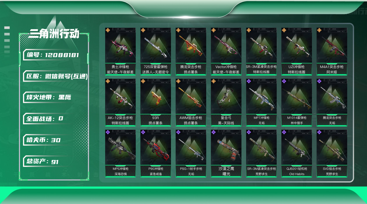 [12088181]总资产:91.9M 1干员外观 11传说枪械 哈夫币:30.145K 高级安全箱(9.15到期) 可二次 可修改实名 永久社交场景限制 烽火地带段位:黑鹰 全面战场段位:校官 传说武器皮肤:UZI冲锋枪-特斯拉线圈,AWM狙击步枪-捞点薯条,腾龙突击步枪-捞点薯条,93R-捞点薯条,AK-12突击步枪-特斯拉线圈,SR-3M紧凑突击步枪-特斯拉线圈,勇士冲锋枪-能天使-午夜邮差,Vector冲锋枪-能天使-午夜邮差,复合弓-黑-天际线,725双管霰弹枪-送葬人-无题密令,M4A1突击步枪-阿米娅 史诗武器皮肤:G3战斗步枪-锡兰,QJB201轻机枪-Old Habits,M1014霰弹枪-林中猎手,MP5冲锋枪-深海恐惧,M16A4突击步枪-竞赛选手,PTR-32突击步枪-英雄,SCAR-H战斗步枪-囚徒,腾龙突击步枪-无垢,MP7冲锋枪-无垢,PSG-1射手步枪-无垢,SVD狙击步枪-荒野求生,SR-3M紧凑突击步枪-荒野求生,沙漠之鹰-曙光,P90冲锋枪-紧急戒备 干员外观:蜂医-送葬人·无题密令(S5)