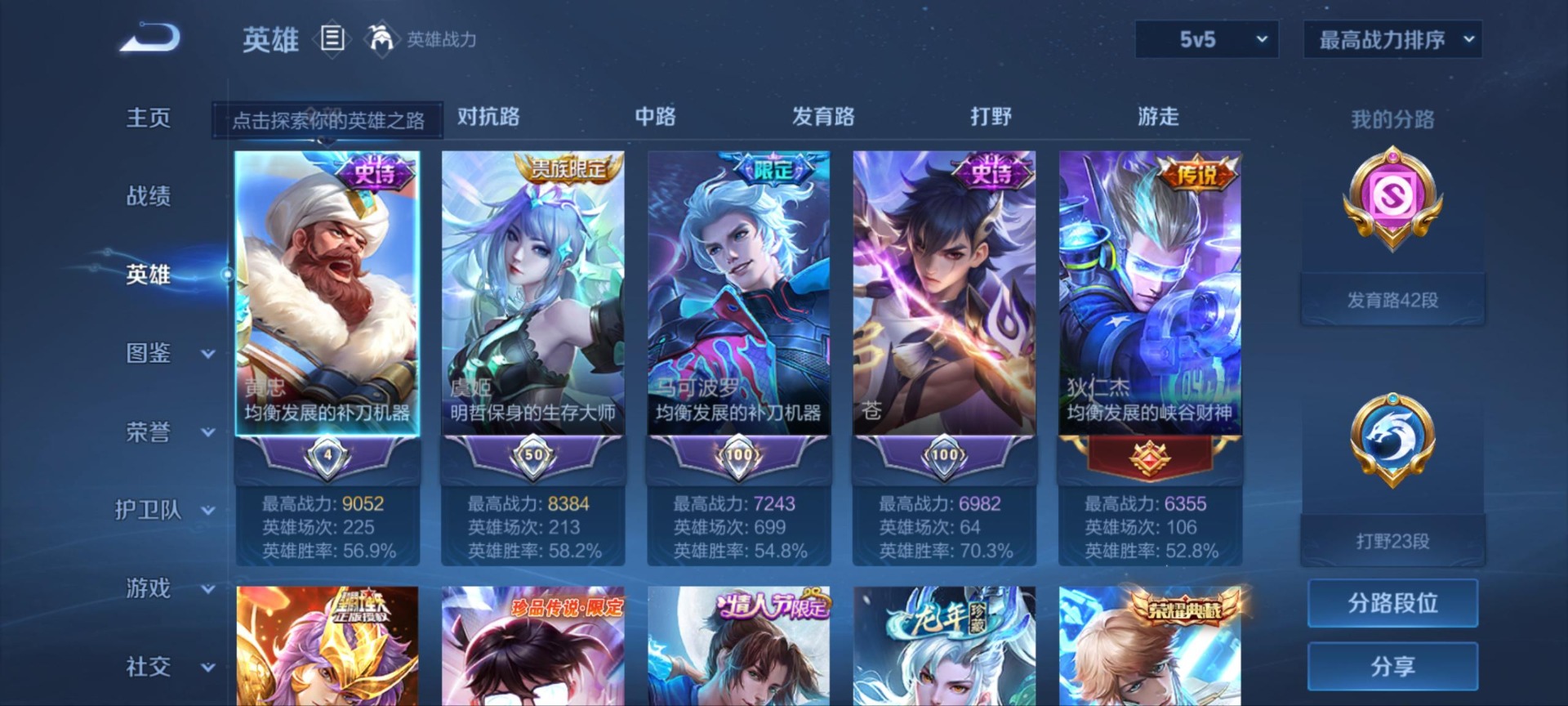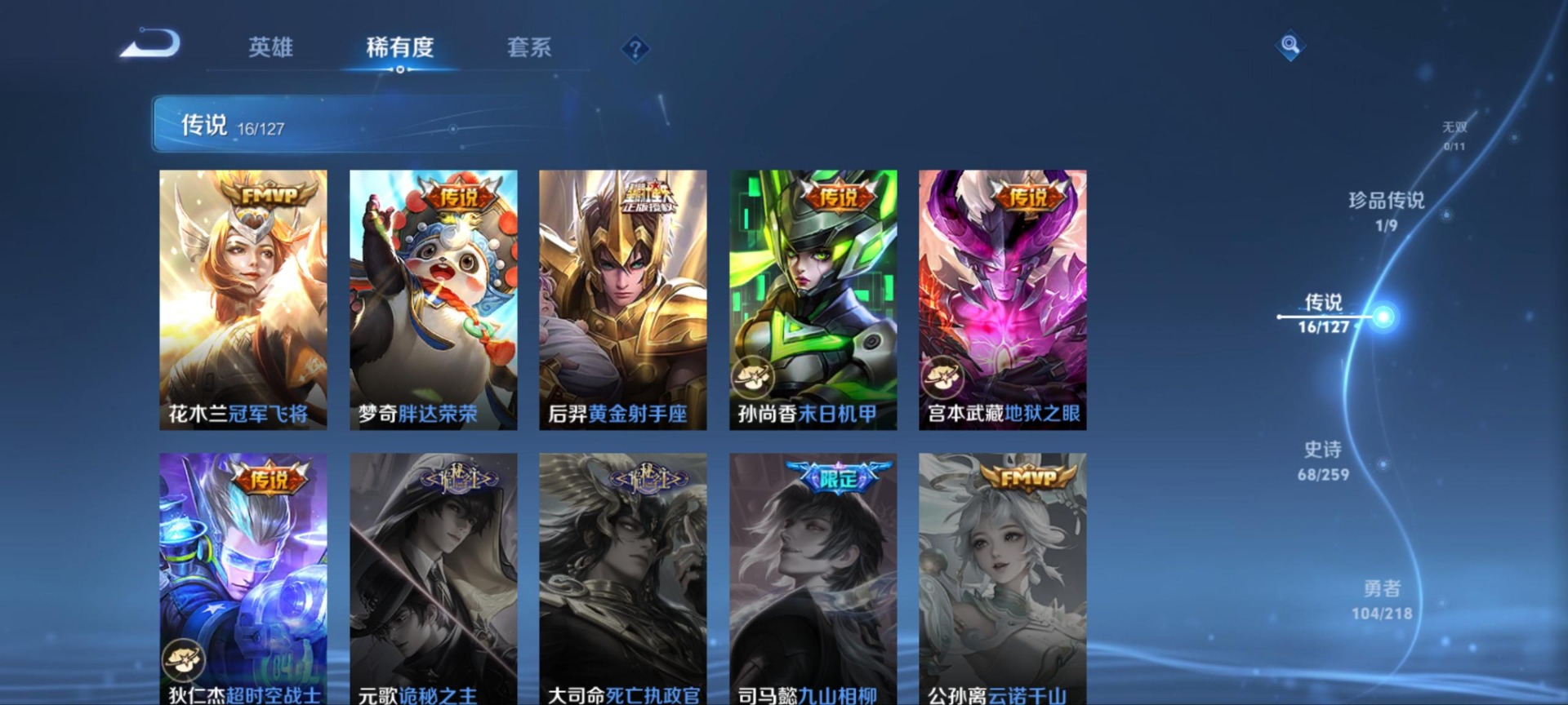 - PX_2096810-贵族等级: V10 英雄数: 126 皮肤数: 622 荣耀水晶: 武则天,无限飓风号,大秦宣太后,鸣剑·曳影,全息碎影,九霄神辉,赤影疾锋,弑枪猎影 无双皮: 碎月剑心,小乔时之魔女,器灵·螭龙剑 珍品传说: 怪盗基德,时之奇旅-孙策,器灵·落星盏,兔狲·蓬尾,酷洛米之心,大耳狗之梦,朽木白哉,黑崎一护 星传说: 幻海之心,幽冥之眼,时之思念,星际治安官,玉鸾吟 传说皮: