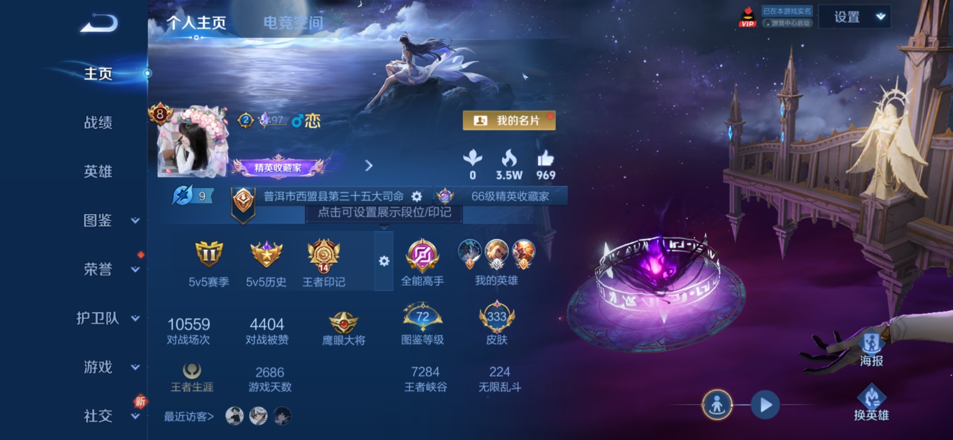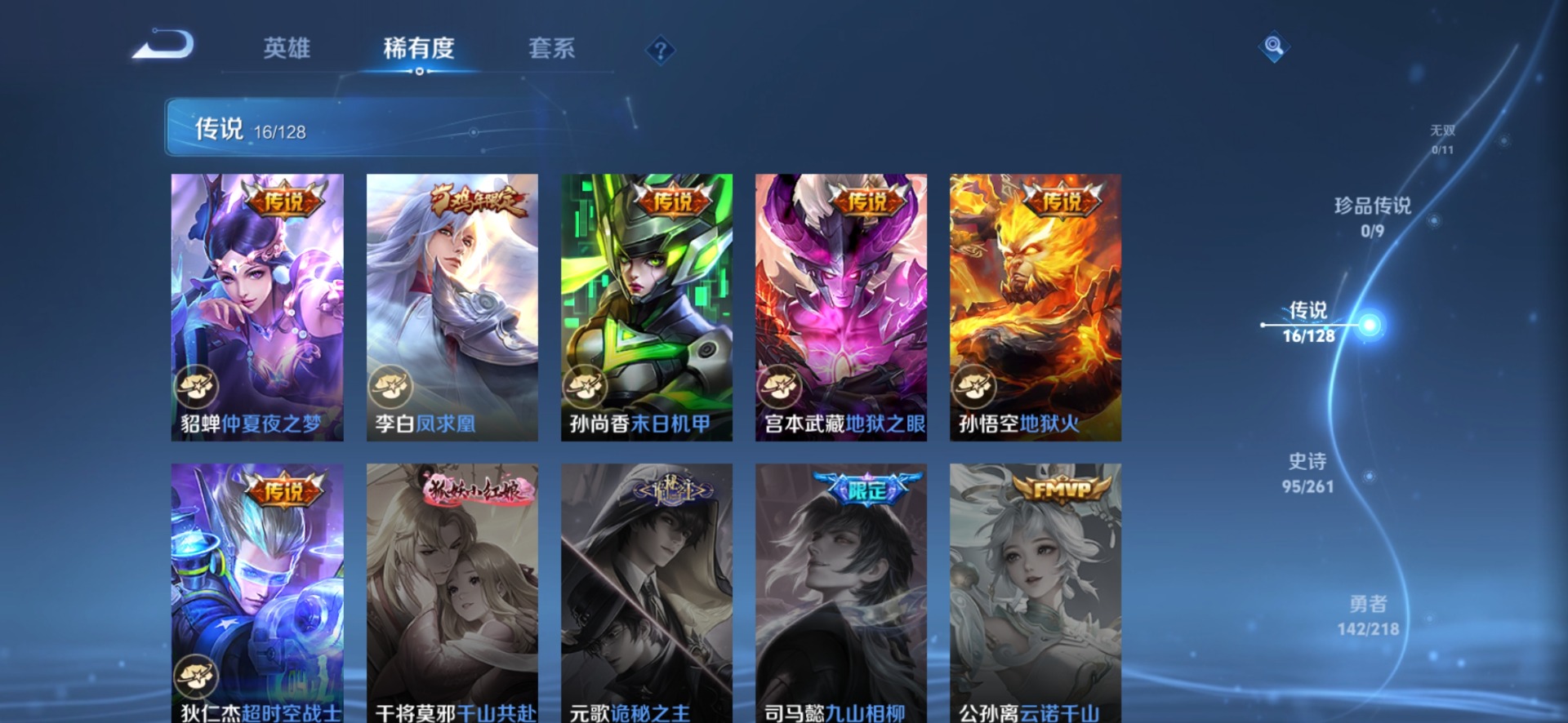 - PX_2095053-实名: 可修改 贵族等级: V5 英雄数: 124 皮肤数: 138 星传说: 星际治安官 传说皮: 黄金白羊座,超时空战士-狄仁杰,澜逐花归海,典韦战鼓燎原,云诺千山 限定皮: 鸣野蒿,陌上桑,愿照·九州拓