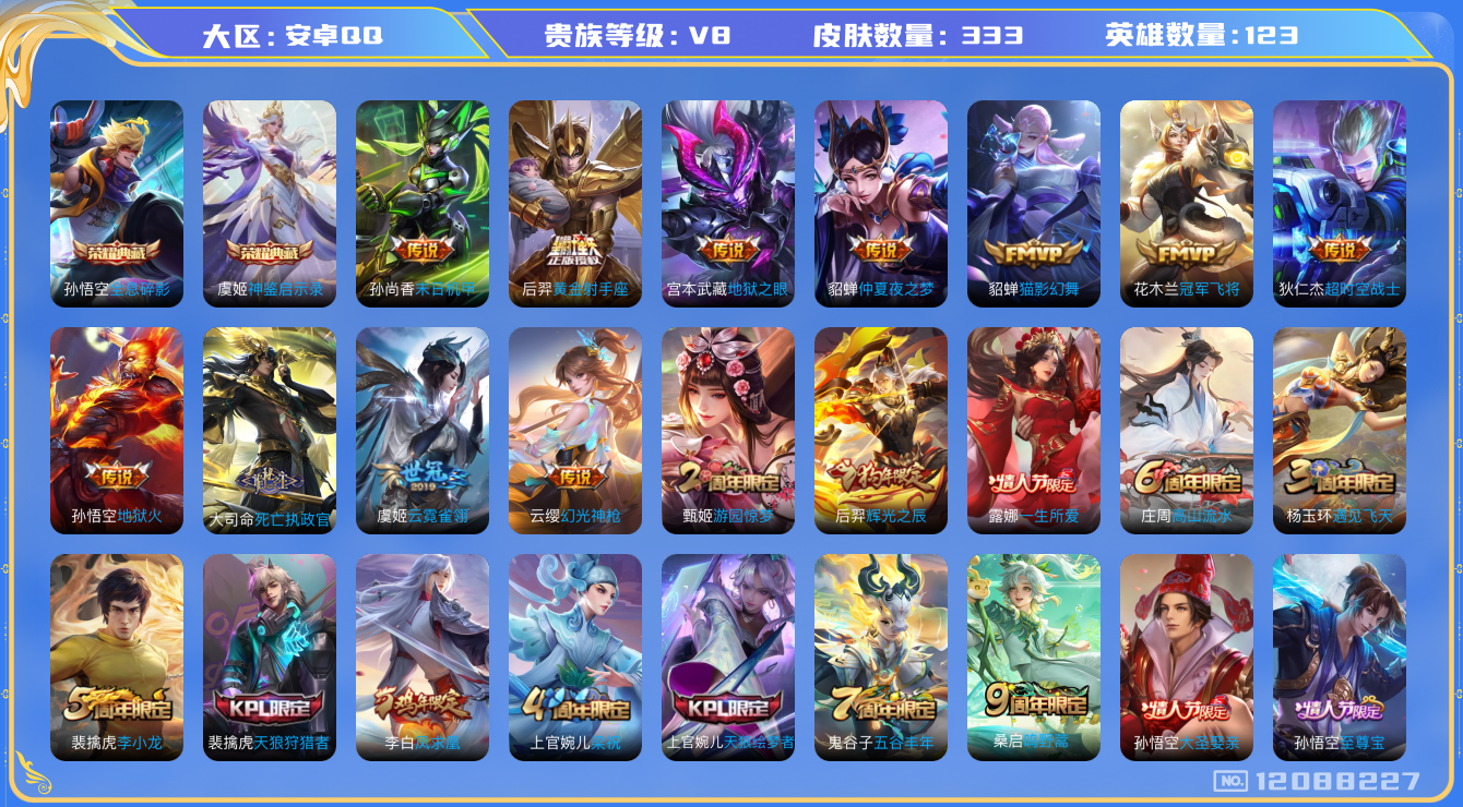 [12088227]V8 2典藏 16传说 123英雄 333皮肤 可修改实名 优质装备:全息碎影(猴子典藏),神鉴启示录,黄金射手座,冠军飞将,猫影幻舞,云霓雀翎,末日机甲-孙尚香(绿蚂蚱),地狱火,仲夏夜之梦(大飞蛾),地狱之眼,超时空战士-狄仁杰 传说皮:死亡执政官,幻光神枪 珍宝阁皮:妄想食味,玩趣恶龙 限定皮:愿照·九州拓(澜年限),鸣野蒿,至尊宝,白虎志(电光耗子),凤求凰(白切鸡),飞衡(韩信年限),遇见飞天,高山流水,五谷丰年,游园惊梦,梁祝,天狼狩猎者,天狼绘梦者,李小龙,朱雀志(守约年限),辉光之辰,一生所爱,大圣娶亲,引擎之心,神奇女侠 史诗皮:化蝶舞,星界战将,龙之律动,百相守梦-周瑜,茶境仙,破空之剑,蒙犽顽岩魄,蔬乡物语(鲁班七号),百相守梦-黄忠,紫霞仙子,苍穹之光,电玩小子(小书包),白龙吟,黄金分割率,特工魅影,千年之狐,江河有灵,百解令(蒙犽),高渐离燃音魔法,蒙恬荣光圣徽,无限星赏官,冰冠公主,偶像歌手,白蛇,末日机甲-吕布,猫狗日记-孙策,猫狗日记-大乔,乱世虎臣,节奏热浪,女仆咖啡,摇滚巨星,水果甜心,绅士熊喵,天才门将,星夜王子,心灵骇客,功夫厨神,德古拉伯爵,暗隐猎兽者,幽灵船长,鬼剑武藏,心灵战警,舞动绿茵,地狱岩魂,纤云弄巧,繁星吟游(呼啦呼啦),拒霜思,缤纷独角兽,乘风破浪,逐浪之夏,水晶猎龙者,曙光守护者,箭羽风息,金属风暴,原初追逐者,圣诞狂欢,圣诞恋歌,鹰眼统帅,暗夜贵公子,魅力维加斯,无心,未来纪元-赵云