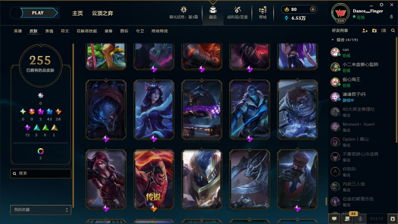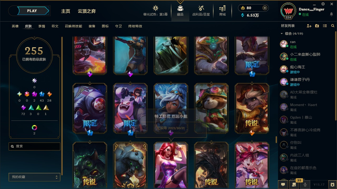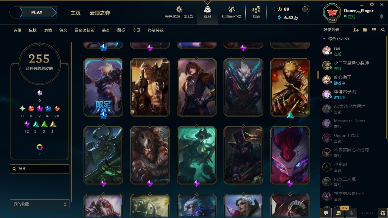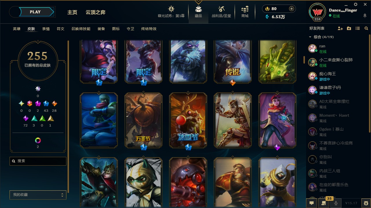 [12088655]2神话 43限定 28传说 72史诗 255皮肤 6炫彩 171英雄 可二次 可修改实名 优质装备:防爆天使 凯尔,暗影 沃里克,巧克力工坊 波比,都铎王朝 图奇,夺命美人 卡特,钢铁之翼 凤凰,冠军典狱长 锤石,冠军之箭 艾希,冠军之刃 锐雯,冠军之刃 锐雯 2016,警用试作体K-9 内瑟斯,蓝色忧郁 崔斯特,女猎手 希维尔,诺斯费拉图 弗拉基米尔,冠军之刃 锐雯 2016 凯旋圣装,外星装甲 库奇,净雪之月 莫甘娜 冬虹,魔女 阿卡丽 虚荣 海克斯:海克斯 安妮 赛季限定皮:胜利女神 希维尔,胜利之树 茂凯,胜利枪神 格雷福斯 冠军限定系列:S13 T1 李青,S1FNC 酒桶,S2 暗杀星 努努,S2 暗杀星 慎,S3 SKT T1 贾克斯,S3 SKT T1 李青,S4 SSW 图奇,S6 SKT T1 艾克 冰雪节限定:冰雪节 炼金,冬季仙境 发条,冬季仙境 卡尔玛,胡桃夹子 小丑,平安夜女神 娑娜,圣诞开心鬼 提莫,圣诞老人 酒桶,圣诞糖果棒 厄运小姐,圣诞驯鹿 克格莫,冰雪节 茂凯,幸福女神 乐芙兰,雪默丁格,英勇玩具兵船长 泳池派对:泳池派对 吉格斯 万圣节限定:鬼影森森 茂凯,鬼影重重 魔腾,魅惑女巫 奈德丽,南瓜头 费德提克,无头骑士 人马 周年:10周年 安妮