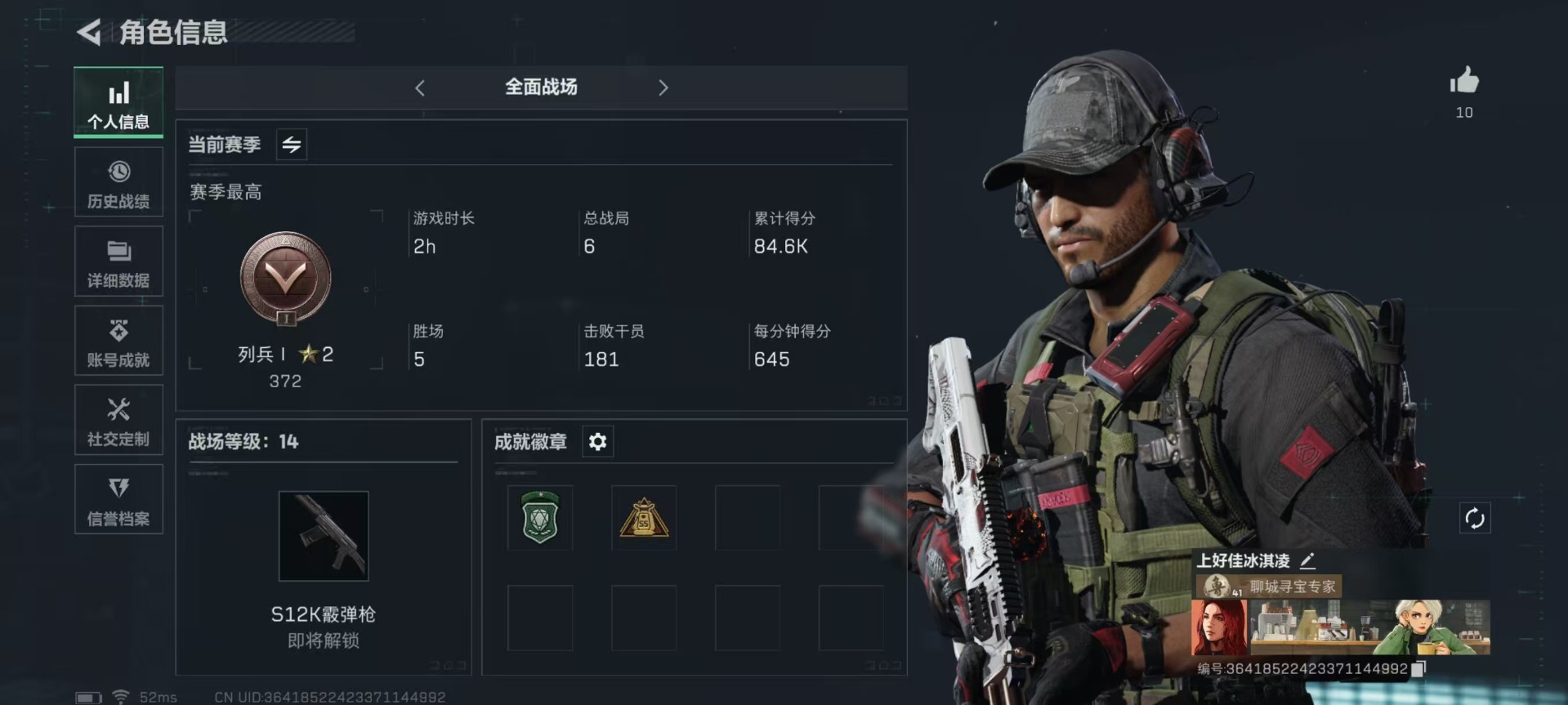 [12088800]总资产:459.9M 1近战传说 12传说枪械 哈夫币:61.261K 可二次 可修改实名 优质装备:近战-北极星 烽火地带段位:三角洲巅峰 全面战场段位:列兵 传说武器皮肤:UZI冲锋枪-特斯拉线圈,M16A4突击步枪-狩猎时刻,AK-12突击步枪-特斯拉线圈,SR-3M紧凑突击步枪-特斯拉线圈,勇士冲锋枪-能天使-午夜邮差,Vector冲锋枪-狩猎时刻,G3战斗步枪-狩猎时刻,复合弓-黑-天际线,725双管霰弹枪-送葬人-无题密令,M4A1突击步枪-阿米娅,CAR-15突击步枪-阿米娅 史诗武器皮肤:AUG突击步枪-蝮蛇,QJB201轻机枪-Old Habits,MP5冲锋枪-深海恐惧,M16A4突击步枪-竞赛选手,M250通用机枪-囚徒,SV-98狙击步枪-林中猎手,SV-98狙击步枪-囚徒,SCAR-H战斗步枪-囚徒,腾龙突击步枪-无垢,MP7冲锋枪-无垢,PSG-1射手步枪-无垢,SVD狙击步枪-荒野求生,SR-3M紧凑突击步枪-荒野求生,PKM通用机枪-荒野求生,QBZ95-1突击步枪-曙光,P90冲锋枪-紧急戒备