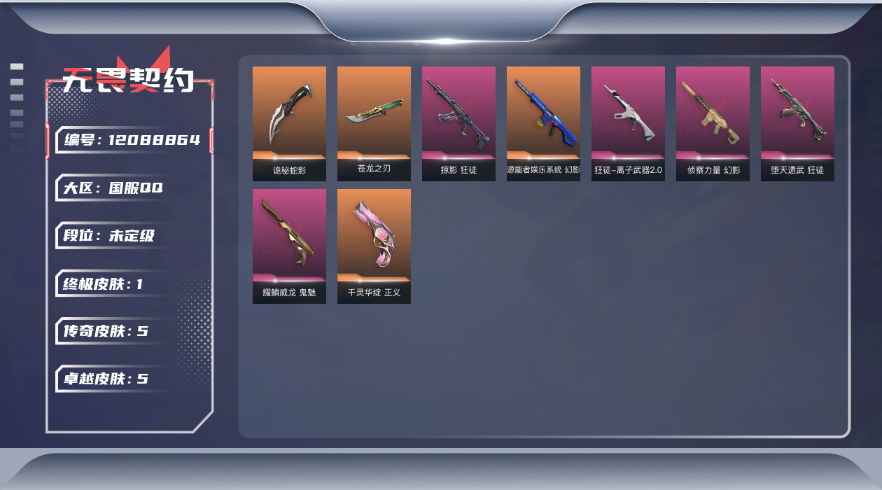 [12088864]5橙皮 1金皮 5紫皮 35皮肤 22英雄 52卡面 490已用源晶 未定级 优质装备:幻影-源能者娱乐系统,狂徒-掠影,幻影-侦察力量,正义-千灵华绽,诡秘蛇影,苍龙之刃,鬼魅-耀鳞威龙 步枪皮肤:狂徒-离子武器2.0,狂徒-堕天遗武