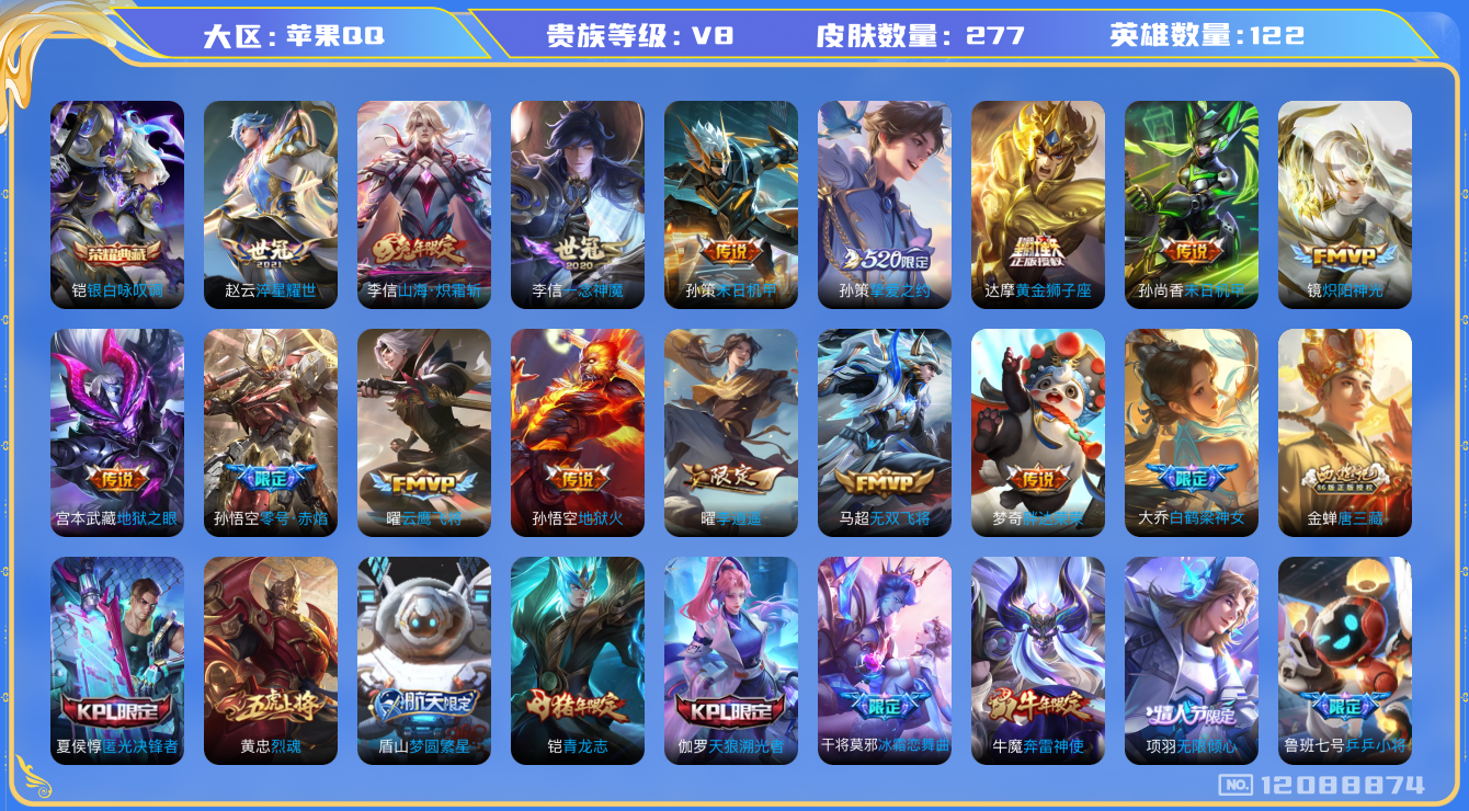 - [11684988]V8 1典藏 26传说 125英雄 319皮肤 可修改实名 优质装备:九霄神辉(木兰典藏),黄金狮子座,云鹰飞将(小将军),炽阳神光,一念神魔,云霓雀翎,飞鸢探春,游龙清影(小青龙),淬星耀世,末日机甲-孙策,无双飞将,浮生妄,记忆之芯(机甲兔),鹤归松栖(云缨),澜逐花归海 传说皮:落雪白狼 珍宝阁皮:妄想食味,优雅恋人,玩趣恶龙 限定皮:愿照·九州拓(澜年限),愿照·山河定(司空震年限),愿照·千秋盛(女娲年限),鸣野蒿,至尊宝,傲雪梅枪,前尘镜,时雨天司(水龙头),神威(电光马子),山海·碧波行(瑶年限),无限倾心-项羽,高山流水,诗剑行,降魔,五谷丰年,幽恒(沐浴露),梁祝,岱宗(典韦年限),李小龙,如梦令-后羿,孙行者,猪悟能,寅虎·瑞焰(虎皮蛋子),寅虎·心曲(虎婆),寅虎·赤拳(老虎年限),时之奇旅-妲己,山海·玄木吟(马可年限) 史诗皮:鸭鸭历险记-刘禅,器灵·浮梦炉,瑰影绮梦,化蝶舞,星界战将,龙之律动,藏狐·褐绒,石田雨龙,百相守梦-周瑜,茶境仙,幻珠鲛人,海诺心动手记,破空之剑,东方月初,蒙犽顽岩魄,蔬乡物语(鲁班七号),超元猎域,乘龙·忆丹青(大乔年限),琥珀纪元伽罗,百相守梦-百里守约,守夜人,百相守梦-黄忠,紫霞仙子,电玩小子(小书包),黄金分割率,特工魅影,千年之狐,永昼,百相守梦(刘备),百相守梦(关羽),电玩·爆裂旋风,江河有灵,雪夜绮愿(周瑜),高渐离燃音魔法,蒙恬荣光圣徽,暗夜猫娘,魅语,末日机甲-吕布,猫狗日记-孙策,猫狗日记-大乔,乱世虎臣,节奏热浪,修罗,女仆咖啡,摇滚巨星,水果甜心,天才门将,星夜王子,心灵骇客,功夫厨神,德古拉伯爵,暗隐猎兽者,幽灵船长,鬼剑武藏,暗渊魔法,心灵战警,乐园奇幻夜,天秀·启明,舞动绿茵,地狱岩魂,纤云弄巧,拒霜思,缤纷独角兽,乘风破浪,逐浪之夏,龙鼓争鸣,月团寄思,水晶猎龙者,曙光守护者,原初追逐者,圣诞狂欢,圣诞恋歌,鹰眼统帅,暗夜贵公子,魅力维加斯,雪上飞焰,奇遇舞章,顽趣-阿古朵,无心,未来纪元-赵云