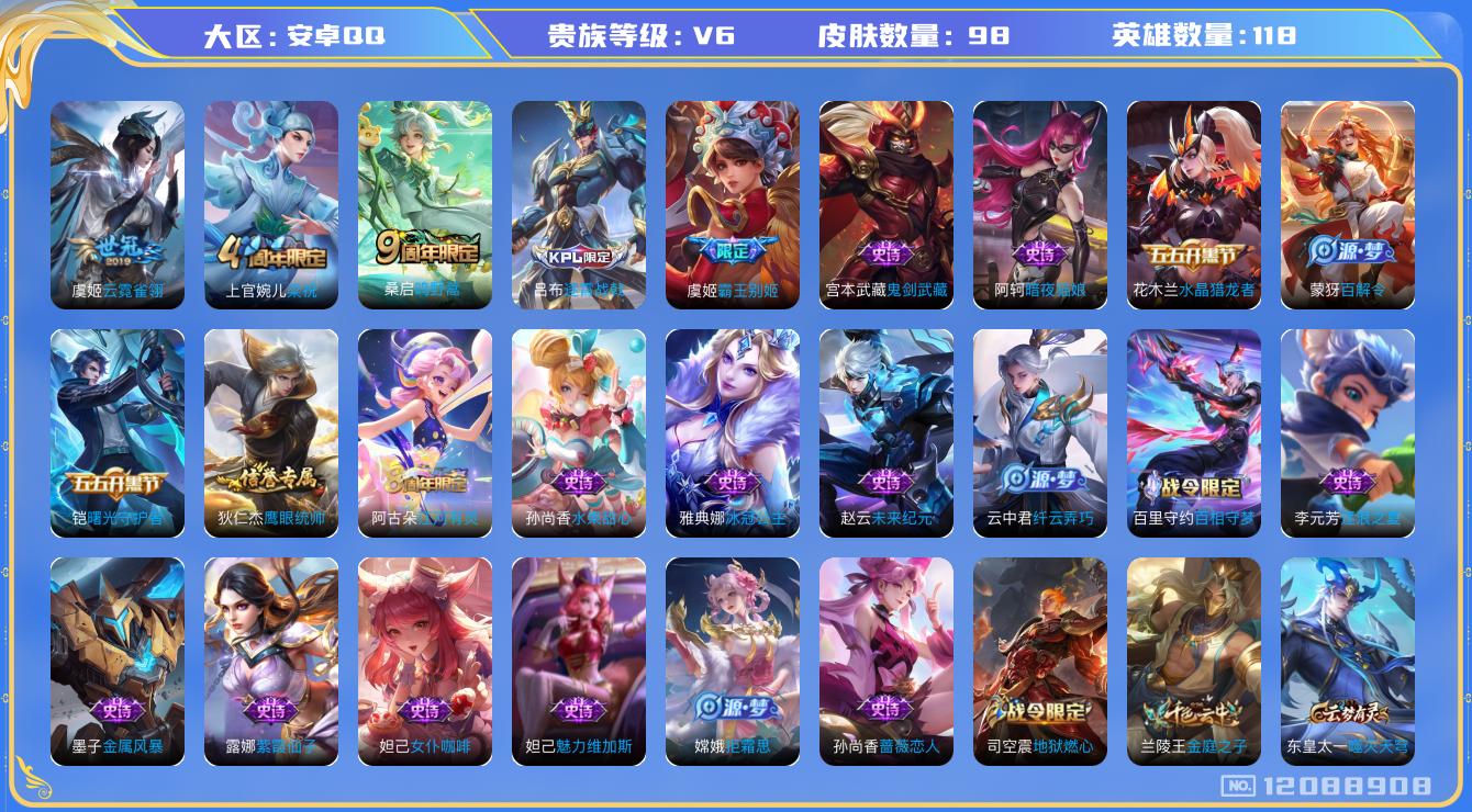 - [11297677]V6 1典藏 2传说 123英雄 206皮肤 可修改实名 优质装备:鸣剑·曳影 传说皮:幻光神枪 珍宝阁皮:妄想食味,蔷薇恋人 限定皮:逐霄战戟,鸣野蒿,高山流水,五谷丰年,大圣娶亲 史诗皮:器灵·浮梦炉,化蝶舞,星界战将,谪仙醉月,戍鼓铭心,茶境仙,破空之剑,蒙犽顽岩魄,蔬乡物语(鲁班七号),乘龙·聚宝船(安琪拉年限),百相守梦-百里守约,紫霞仙子,特工魅影,千年之狐,江河有灵,高渐离燃音魔法,冰冠公主,偶像歌手,晚萤,末日机甲-吕布,猫狗日记-孙策,时之恋人-孙尚香,节奏热浪,水果甜心,绅士熊喵,心灵骇客,德古拉伯爵,暗隐猎兽者,幽灵船长,鬼剑武藏,舞动绿茵,地狱岩魂,缤纷独角兽,乘风破浪,逐浪之夏,箭羽风息,唤灵魅影,金属风暴,原初追逐者,圣诞恋歌,鹰眼统帅,未来纪元-赵云