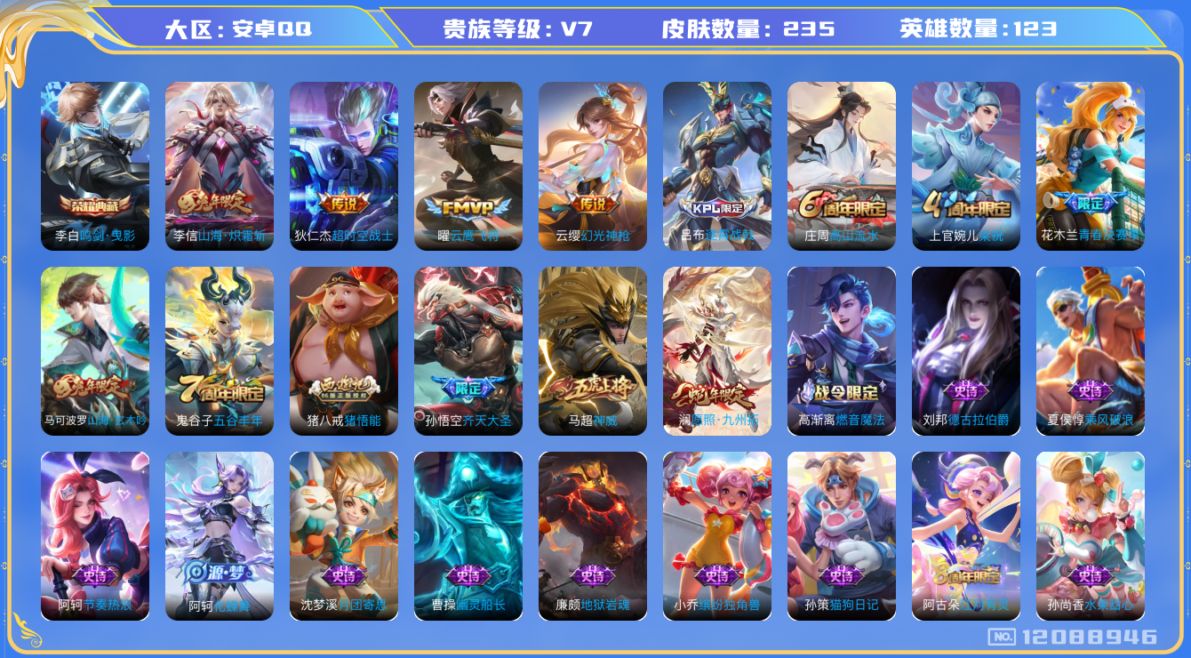 [12088946]V7 1典藏 6传说 123英雄 235皮肤 可修改实名 优质装备:鸣剑·曳影,云鹰飞将(小将军),超时空战士-狄仁杰,山海·炽霜斩(李信年限) 传说皮:幻光神枪 珍宝阁皮:蔷薇恋人,玩趣恶龙 限定皮:愿照·九州拓(澜年限),逐霄战戟,神威(电光马子),高山流水,齐天大圣,五谷丰年,梁祝,猪悟能,青春决赛季,山海·玄木吟(马可年限) 史诗皮:鸭鸭历险记-刘禅,器灵·浮梦炉,化蝶舞,龙之律动,蔬乡物语(鲁班七号),紫霞仙子,特工魅影,永昼,电玩·爆裂旋风,江河有灵,百解令(蒙犽),高渐离燃音魔法,蒙恬荣光圣徽,偶像歌手,冰冠公主,末日机甲-吕布,猫狗日记-孙策,节奏热浪,修罗,女仆咖啡,水果甜心,星夜王子,心灵骇客,功夫厨神,德古拉伯爵,暗隐猎兽者,幽灵船长,鬼剑武藏,地狱岩魂,纤云弄巧,拒霜思,缤纷独角兽,乘风破浪,逐浪之夏,月团寄思,水晶猎龙者,金属风暴,圣诞狂欢,圣诞恋歌,鹰眼统帅,魅力维加斯,无心,未来纪元-赵云