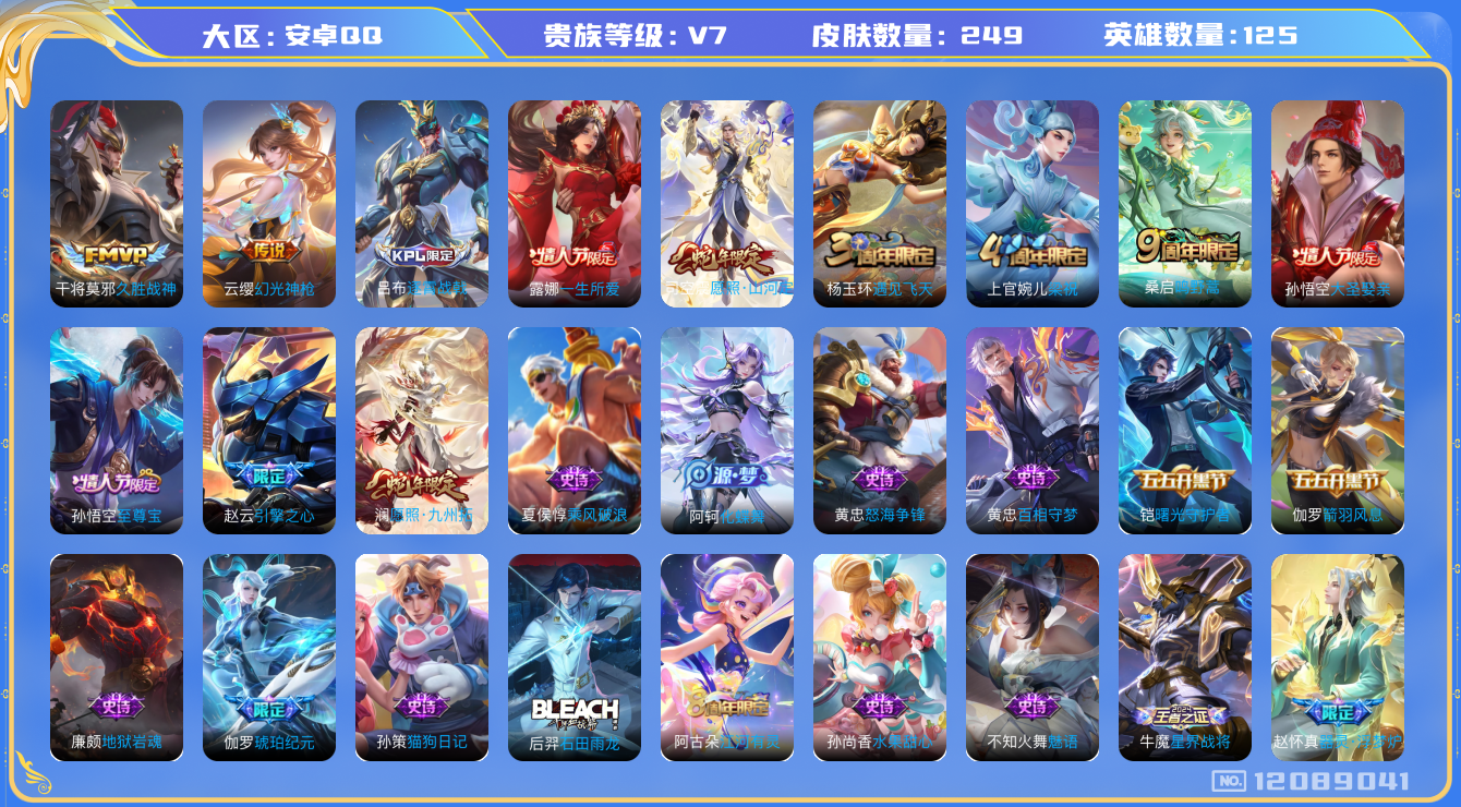[12089041]V7 5传说 125英雄 249皮肤 可修改实名 优质装备:久胜战神,涂山容容 传说皮:幻光神枪 珍宝阁皮:万物之道,优雅恋人 限定皮:愿照·九州拓(澜年限),愿照·山河定(司空震年限),逐霄战戟,鸣野蒿,至尊宝,遇见飞天,梁祝,一生所爱,大圣娶亲,引擎之心 史诗皮:器灵·浮梦炉,化蝶舞,星界战将,谪仙醉月,龙之律动,石田雨龙,怒海争锋,蒙犽顽岩魄,琥珀纪元伽罗,百相守梦-黄忠,紫霞仙子,白龙吟,黄金分割率,特工魅影,江河有灵,魅语,百解令(蒙犽),蒙恬荣光圣徽,冰冠公主,电玩·爆裂旋风,龙骑士(小龙虾),猫狗日记-孙策,修罗,女仆咖啡,摇滚巨星,水果甜心,星夜王子,功夫厨神,暗隐猎兽者,鬼剑武藏,舞动绿茵,地狱岩魂,纤云弄巧,拒霜思,乘风破浪,逐浪之夏,水晶猎龙者,曙光守护者,箭羽风息,金属风暴,原初追逐者,圣诞狂欢,圣诞恋歌,鹰眼统帅,魅力维加斯,未来纪元-赵云,玫瑰异探