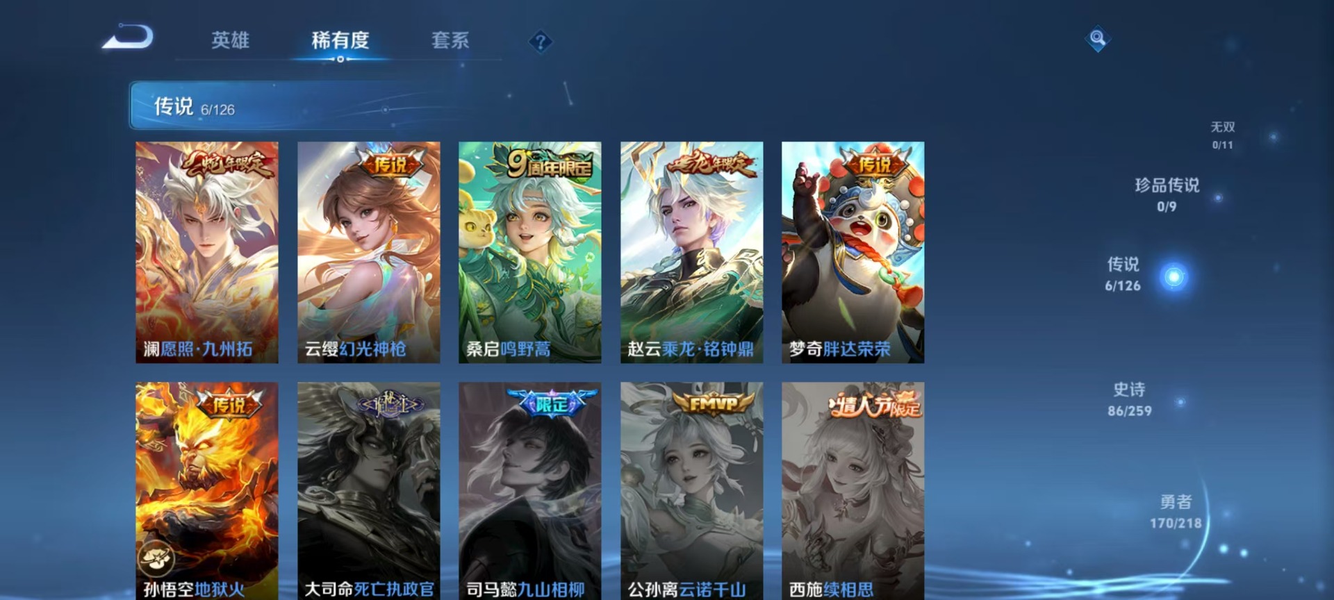 - [12030401]V7 6传说 123英雄 234皮肤 可修改实名 优质装备:云鹰飞将(小将军),绛天战甲(鸡嘴战神),一念神魔,超时空战士-狄仁杰,涂山容容 传说皮:典韦战鼓燎原 珍宝阁皮:胡桃夹子,玩趣恶龙 限定皮:鸣野蒿,至尊宝,五谷丰年,山海·玄木吟(马可年限) 史诗皮:鸭鸭历险记-刘禅,化蝶舞,星界战将,龙之律动,石田雨龙,百相守梦-周瑜,茶境仙,蒙犽顽岩魄,蔬乡物语(鲁班七号),百相守梦-百里守约,百相守梦-黄忠,织梦人,苍穹之光,黄金分割率,特工魅影,江河有灵,魅语,百解令(蒙犽),偶像歌手,末日机甲-吕布,猫狗日记-孙策,时之恋人-孙尚香,节奏热浪,修罗,女仆咖啡,摇滚巨星,水果甜心,绅士熊喵,星夜王子,心灵骇客,功夫厨神,暗隐猎兽者,幽灵船长,鬼剑武藏,心灵战警,乐园奇幻夜,天秀·启明,缤纷独角兽,乘风破浪,逐浪之夏,曙光守护者,箭羽风息,唤灵魅影,金属风暴,圣诞狂欢,魅力维加斯,赏金猎手,未来纪元-赵云