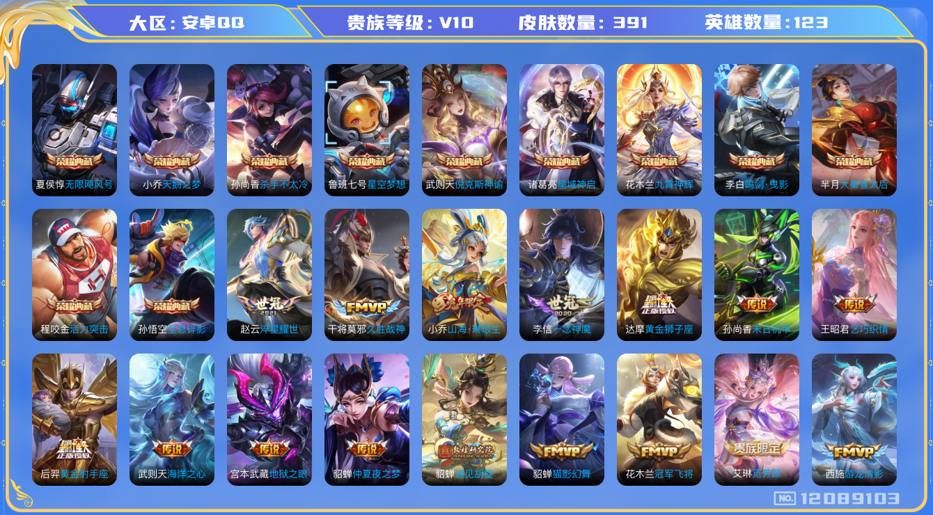 [12089103]V10 11典藏 30传说 123英雄 391皮肤 典藏英雄武则天 可修改实名 优质装备:天鹅之梦(小乔典藏),星空梦想(太空人),倪克斯神谕(宇宙婆娘),无限飓风号(高达),活力突击,杀手不太冷,大秦宣太后,鸣剑·曳影,全息碎影(猴子典藏),星域神启(倪克斯贼亮),九霄神辉(木兰典藏),黄金狮子座,黄金射手座,冠军飞将,云鹰飞将(小将军),黄金白羊座,猫影幻舞,久胜战神,一念神魔,云霓雀翎,末日机甲-孙尚香(绿蚂蚱),仲夏夜之梦(大飞蛾),零号·赤焰,海洋之心,地狱之眼,胖达荣荣,乞巧织情,游龙清影(小青龙),淬星耀世,超时空战士-狄仁杰,遇见胡旋,山海·琳琅生(小乔年限),艾琳觅芳踪 珍宝阁皮:蔷薇恋人,女武神 限定皮:至尊宝,白虎志(电光耗子),太华(伽罗年限),异界灵契(白毛香),傲雪梅枪,时之彼端,白晶晶,神威(电光马子),飞衡(韩信年限),玄嵩(庄周年限),山海·碧波行(瑶年限),遇见飞天,高山流水,五谷丰年,青龙志(铠年限),幽恒(沐浴露),天狼运算者,游园惊梦,梁祝,烈魂,岱宗(典韦年限),天狼溯光者,天狼征服者,奔雷神使(牛魔年限),天狼绘梦者,李小龙,逐梦之影,朱雀志(守约年限),永曜之星,辉光之辰,如梦令-嫦娥,如梦令-后羿,纯白花嫁,孙行者,猪悟能,天魔缭乱,热情桑巴,匿光追影者,寅虎·御盾(廉颇年限),寅虎·赤拳(老虎年限),时之祈愿-云中君,时之祈愿-瑶(瑶传限),百木心枪,时之奇旅-妲己 史诗皮:遇见神鹿,紫霞仙子,苍穹之光,电玩小子(小书包),黄金分割率,特工魅影,千年之狐,永昼,江河有灵,百解令(蒙犽),偶像歌手,龙骑士(小龙虾),暗夜猫娘,魅语,无限星赏官,晚萤,冰冠公主,末日机甲-吕布,猫狗日记-孙策,猫狗日记-大乔,乱世虎臣,节奏热浪,修罗,女仆咖啡,摇滚巨星,水果甜心,绅士熊喵,天才门将,星夜王子,心灵骇客,时之奇旅-安琪拉,功夫厨神,德古拉伯爵,暗隐猎兽者,幽灵船长,鬼剑武藏,暗渊魔法,心灵战警,乐园奇幻夜,舞动绿茵,地狱岩魂,纤云弄巧,繁星吟游(呼啦呼啦),拒霜思,缤纷独角兽,乘风破浪,逐浪之夏,水晶猎龙者,曙光守护者,箭羽风息,金属风暴,原初追逐者,圣诞狂欢,圣诞恋歌,鹰眼统帅,暗夜贵公子,魅力维加斯,黎明之约,雪上飞焰,奇遇舞章,寅虎·御盾,无心,未来纪元-赵云