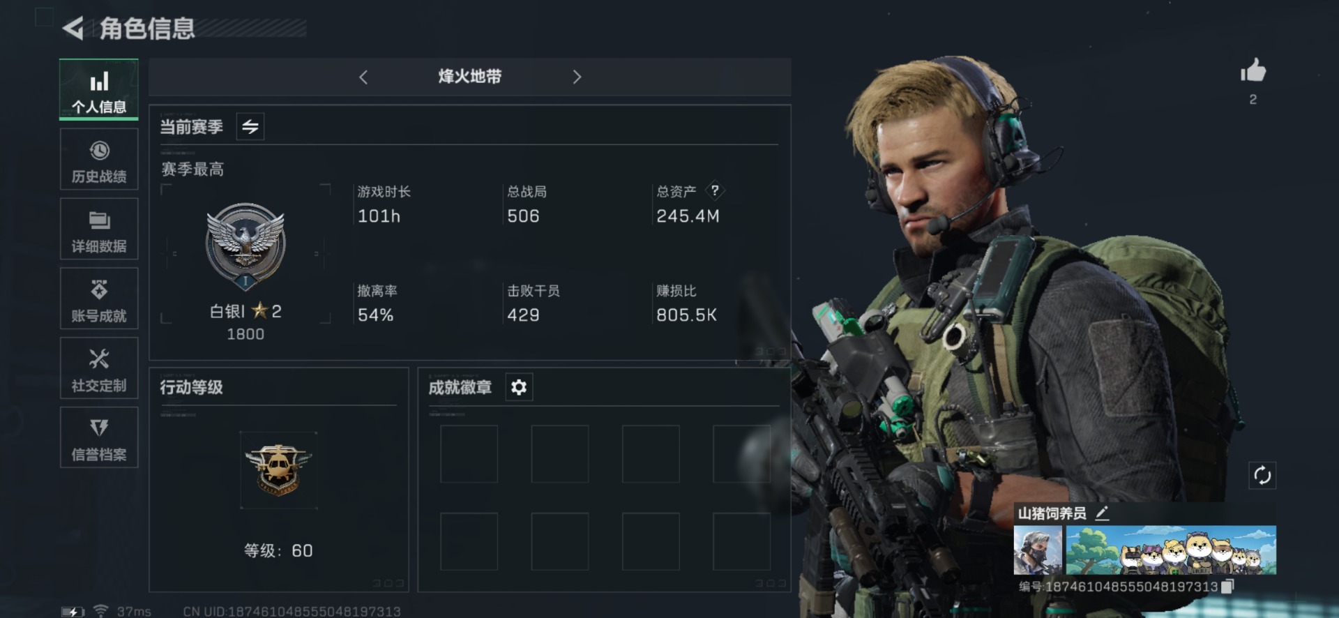 - [11440520]总资产:414M 3干员外观 1近战传说 14传说枪械 哈夫币:300K 可二次 可修改实名 优质装备:近战-黑海,顶级安全箱(3x3) 烽火地带段位:黑鹰 全面战场段位:军士长 传说武器皮肤:QCQ171冲锋枪-风林火山,SR-25射手步枪-水墨云图,SCAR-H战斗步枪-铁艺苍穹,AK-12突击步枪-夜鹰,SMG45冲锋枪-骑士,Vector冲锋枪-狩猎时刻,G3战斗步枪-狩猎时刻,M16A4突击步枪-狩猎时刻,勇士冲锋枪-能天使-午夜邮差,725双管霰弹枪-送葬人-无题密令,P90冲锋枪-神秘艺术,M7战斗步枪-神秘艺术,M7战斗步枪-维京 史诗武器皮肤:SR-3M紧凑突击步枪-英雄,QBZ95-1突击步枪-ACE,M4A1突击步枪-特勤执行,AUG突击步枪-特勤执行,Vector冲锋枪-红色彗星,PTR-32战斗步枪-ACE,AUG突击步枪-蝮蛇,M700狙击步枪-蝮蛇,PKM通用机枪-蝮蛇,G3战斗步枪-战场英杰,Ash-12战斗步枪-守夜人,SVD狙击步枪-暗夜猎手,M16A4突击步枪-竞赛选手,PKM通用机枪-守夜人,AS Val突击步枪-尖端治疗,SG552突击步枪-尖端治疗,SR-25射手步枪-尖端治疗,MP5冲锋枪-深海恐惧,勇士冲锋枪-深海恐惧,AKM突击步枪-林中猎手,SR-3M紧凑突击步枪-荒野求生,M1014霰弹枪-林中猎手,SV-98狙击步枪-林中猎手,PTR-32突击步枪-英雄,AS Val突击步枪-典狱官,SCAR-H战斗步枪-囚徒,PSG-1射手步枪-无垢,M14射手步枪-黑鹰坠落,UZI冲锋枪-危险实验,M249轻机枪-维京,SCAR-H战斗步枪-危险实验,沙漠之鹰-曙光,Vector冲锋枪-阿萨拉文明,S12K霰弹枪-曙光,PKM通用机枪-英雄,QSZ92G-风林火山,93R-博士 干员外观:无名-夜鹰,蜂医-送葬人·无题密令(S5),露娜-黑·天际线