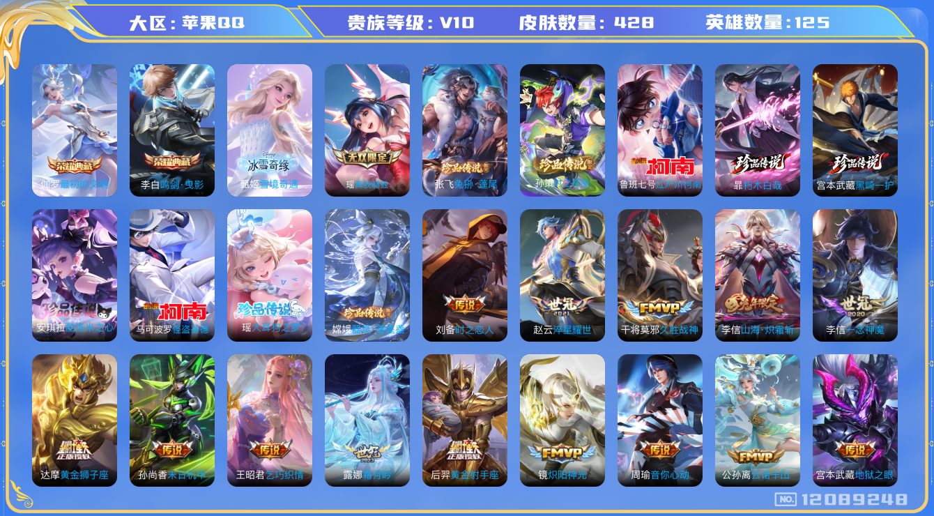[12089248]V10 2典藏 2无双 9珍品传说 49传说 125英雄 428皮肤 可修改实名 女号 优质装备:鸣剑·曳影,真我赫兹(瑶)(瑶无双),雪境奇遇-甄姬,最初的交响(伽罗典藏),江户川柯南,怪盗基德,器灵·落星盏,酷洛米之心,大耳狗之梦,朽木白哉,黑崎一护,黄金狮子座,黄金射手座,冠军飞将,云鹰飞将(小将军),猫影幻舞,久胜战神,炽阳神光,一念神魔,云霓雀翎,末日机甲-孙尚香(绿蚂蚱),仲夏夜之梦(大飞蛾),零号·赤焰,地狱之眼,飞鸢探春,音你心动-周瑜,胖达荣荣,李逍遥,乞巧织情,时之恋人-刘备(电焊工),游龙清影(小青龙),淬星耀世,超时空战士-狄仁杰,无双飞将,山海·炽霜斩(李信年限),浮生妄,霜月吟,艾琳觅芳踪,玄雷天君 珍品传说:时之奇旅-孙策,兔狲·蓬尾 传说皮:死亡执政官,云诺千山,星之鸣奏,祥瑞亨通,幻光神枪 珍宝阁皮:妄想食味,女武神,玩趣恶龙 限定皮:愿照·九州拓(澜年限),愿照·福禄聚(蔡文姬年限),愿照·岁时盈(虞姬年限),愿照·山河定(司空震年限),愿照·众生和(妲己年限),愿照·千秋盛(女娲年限),鸣野蒿,白虎志(电光耗子),梅西,白鹤梁神女,白晶晶,时雨天司(水龙头),神威(电光马子),飞衡(韩信年限),玄嵩(庄周年限),瑞麟志(木兰年限),诗剑行,齐天大圣,匿光决锋者,怒海麟威,五谷丰年,青龙志(铠年限),冰锋战神,武圣,梁祝,御风骁将(吕布年限),天狼狩猎者,逐梦之星,烈魂,奔雷神使(牛魔年限),祈雪灵祝(雪兔子),天狼绘梦者,李小龙,逐梦之影,玄武志(苏烈年限),朱雀志(守约年限),如梦令-后羿,霸王别姬-项羽,奇迹圣诞,默契交锋-花木兰,大圣娶亲,冰霜恋舞曲,无尽星芒,唐三藏,匿光启智者,山海·玄木吟(马可年限) 史诗皮:赞萌露比,鸭鸭历险记-刘禅,苍鳞隐世,器灵·浮梦炉,糖绘人间,化蝶舞,灵蛊蚀心,龙之律动,雪豹·霜爪,藏狐·褐绒,布丁狗之誓,小牛鸭,石田雨龙,百相守梦-周瑜,茶境仙,幻珠鲛人,百相守梦-百里守约,百相守梦-黄忠,遇见神鹿,紫霞仙子,苍穹之光,电玩小子(小书包),白龙吟,黄金分割率,特工魅影,千年之狐,永昼,电玩·爆裂旋风,江河有灵,高渐离燃音魔法,蒙恬荣光圣徽,偶像歌手,龙骑士(小龙虾),白蛇,暗夜猫娘,魅语,无限星赏官,晚萤,冰冠公主,青蛇,末日机甲-吕布,猫狗日记-孙策,猫狗日记-大乔,乱世虎臣,