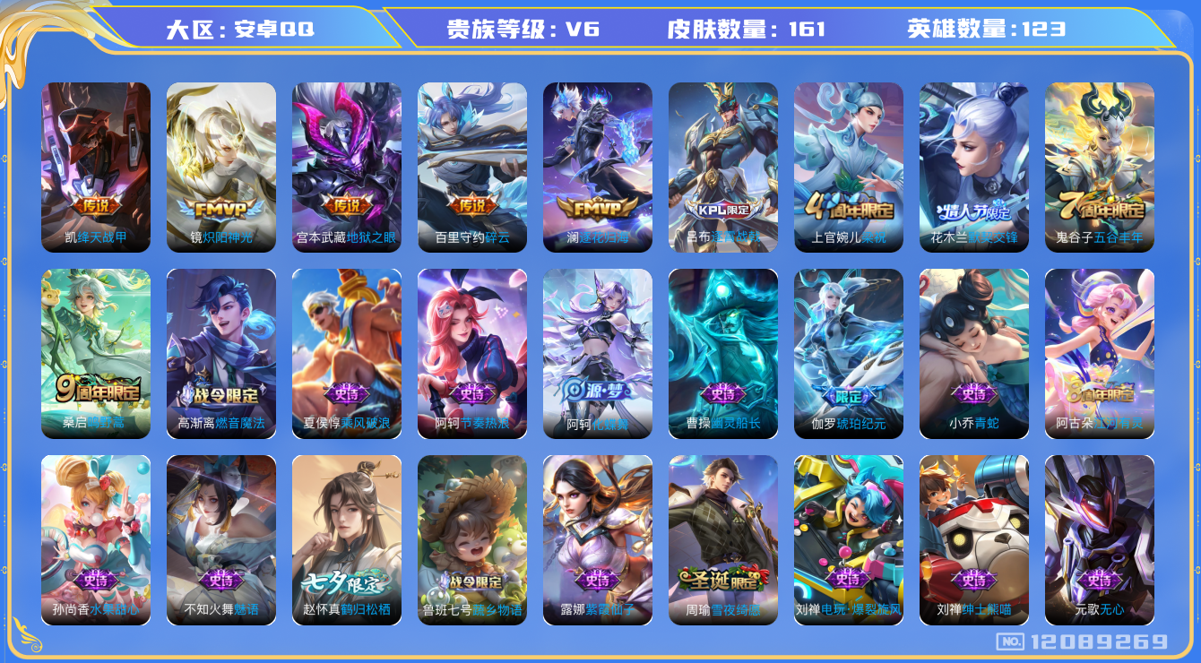 [12089269]V6 6传说 123英雄 161皮肤 可修改实名 优质装备:绛天战甲(鸡嘴战神),炽阳神光,地狱之眼,碎云,澜逐花归海,涂山容容 珍宝阁皮:女武神 限定皮:逐霄战戟,鸣野蒿,五谷丰年,梁祝,默契交锋-花木兰 史诗皮:化蝶舞,琥珀纪元伽罗,蔬乡物语(鲁班七号),紫霞仙子,千年之狐,江河有灵,匿光侦查者,鹤归松栖(赵怀真),雪夜绮愿(周瑜),魅语,百解令(蒙犽),高渐离燃音魔法,蒙恬荣光圣徽,青蛇,晚萤,电玩·爆裂旋风,龙骑士(小龙虾),节奏热浪,修罗,水果甜心,绅士熊喵,星夜王子,暗隐猎兽者,幽灵船长,鬼剑武藏,纤云弄巧,拒霜思,乘风破浪,逐浪之夏,水晶猎龙者,金属风暴,圣诞恋歌,鹰眼统帅,魅力维加斯,无心,未来纪元-赵云