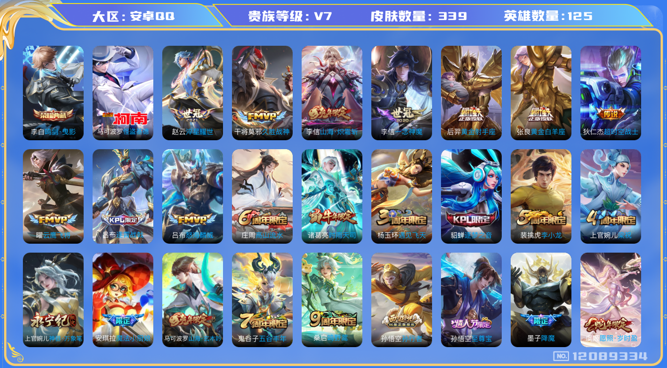 [12089334]V7 1典藏 1珍品传说 12传说 125英雄 339皮肤 可修改实名 优质装备:鸣剑·曳影,怪盗基德,黄金射手座,云鹰飞将(小将军),黄金白羊座,久胜战神,一念神魔,淬星耀世,超时空战士-狄仁杰,山海·炽霜斩(李信年限) 珍宝阁皮:胡桃夹子,优雅恋人,蔷薇恋人 限定皮:愿照·岁时盈(虞姬年限),逐霄战戟,鸣野蒿,至尊宝,魔法小厨娘,时雨天司(水龙头),遇见飞天,高山流水,怒海麟威,降魔,五谷丰年,梁祝,逐梦之音,李小龙,孙行者,神器·万象笔,山海·玄木吟(马可年限) 史诗皮:鸭鸭历险记-刘禅,器灵·浮梦炉,化蝶舞,星界战将,龙之律动,茶境仙,怒海争锋,蒙犽顽岩魄,上官婉儿群星魔术团,蔬乡物语(鲁班七号),百相守梦-黄忠,织梦人,黄金分割率,特工魅影,千年之狐,江河有灵,魅语,百解令(蒙犽),高渐离燃音魔法,蒙恬荣光圣徽,冰冠公主,偶像歌手,电玩·爆裂旋风,百相守梦(刘备),龙骑士(小龙虾),末日机甲-吕布,猫狗日记-孙策,乱世虎臣,节奏热浪,修罗,女仆咖啡,摇滚巨星,水果甜心,绅士熊喵,星夜王子,心灵骇客,功夫厨神,德古拉伯爵,暗隐猎兽者,幽灵船长,鬼剑武藏,心灵战警,地狱岩魂,纤云弄巧,拒霜思,乘风破浪,逐浪之夏,水晶猎龙者,曙光守护者,热力回旋,箭羽风息,金属风暴,原初追逐者,圣诞狂欢,圣诞恋歌,鹰眼统帅,王者之锤,魅力维加斯,黎明之约,赏金猎手,无心,未来纪元-赵云