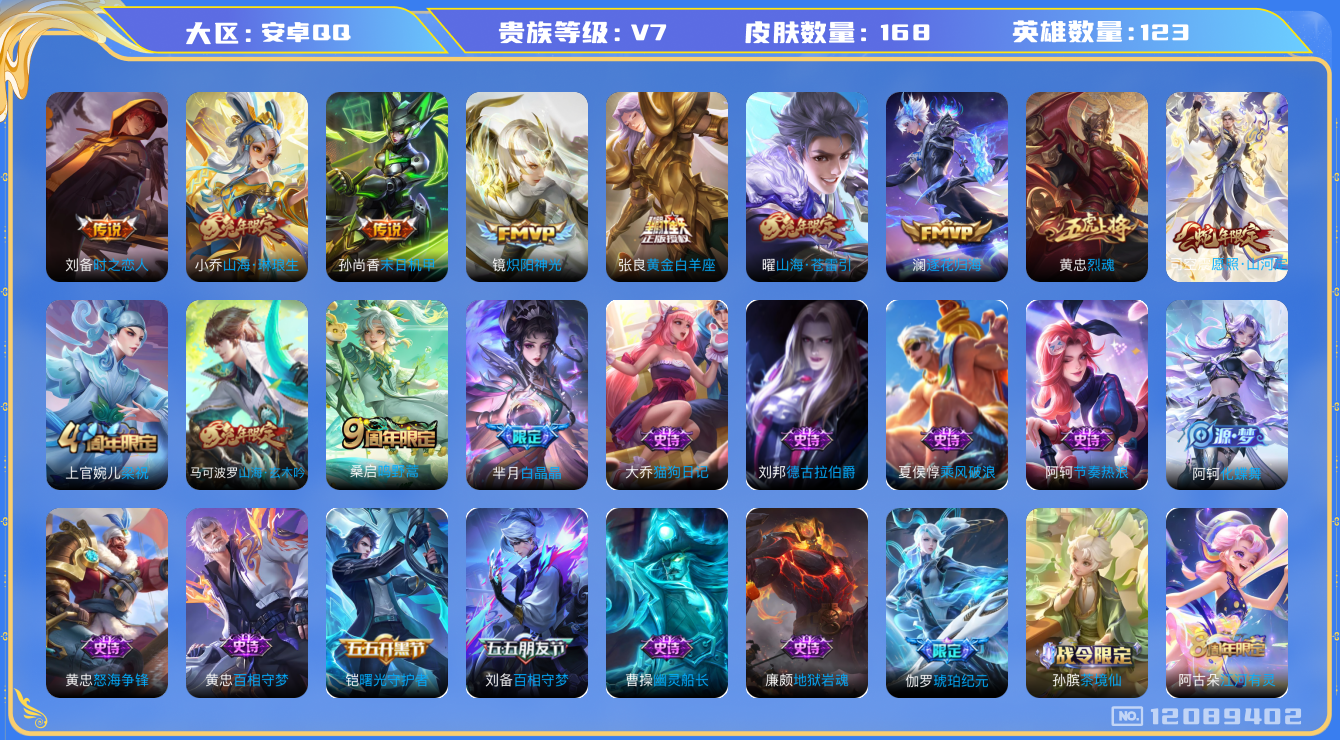 [12089402]V7 9传说 123英雄 168皮肤 可修改实名 优质装备:黄金白羊座,炽阳神光,末日机甲-孙尚香(绿蚂蚱),时之恋人-刘备(电焊工),山海·琳琅生(小乔年限),山海·苍雷引(电光曜子),澜逐花归海 珍宝阁皮:妄想食味 限定皮:愿照·山河定(司空震年限),鸣野蒿,白晶晶,梁祝,烈魂,山海·玄木吟(马可年限) 史诗皮:糖绘人间,化蝶舞,星界战将,百相守梦-周瑜,茶境仙,怒海争锋,琥珀纪元伽罗,百相守梦-黄忠,织梦人,遇见神鹿,电玩小子(小书包),千年之狐,江河有灵,百解令(蒙犽),蒙恬荣光圣徽,电玩·爆裂旋风,百相守梦(刘备),末日机甲-吕布,猫狗日记-大乔,节奏热浪,摇滚巨星,水果甜心,绅士熊喵,天才门将,星夜王子,心灵骇客,德古拉伯爵,暗隐猎兽者,幽灵船长,鬼剑武藏,舞动绿茵,地狱岩魂,纤云弄巧,拒霜思,乘风破浪,逐浪之夏,水晶猎龙者,曙光守护者,金属风暴,原初追逐者,圣诞恋歌,鹰眼统帅,无心