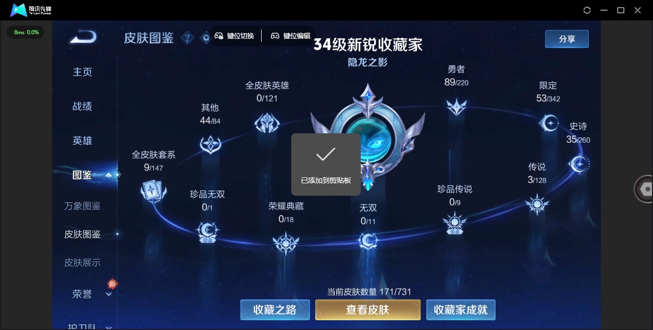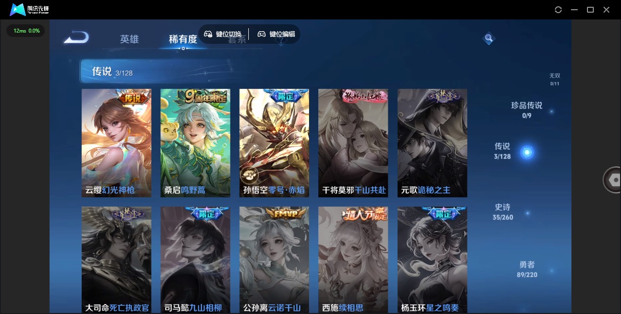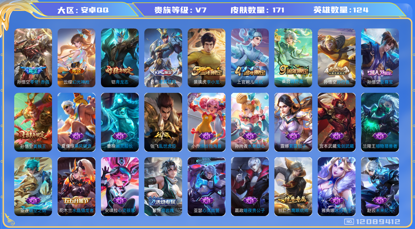[12089412]V7 3传说 124英雄 171皮肤 可修改实名 优质装备:零号·赤焰 传说皮:幻光神枪 珍宝阁皮:蔷薇恋人 限定皮:逐霄战戟,鸣野蒿,至尊宝,青龙志(铠年限),梁祝,李小龙,孙行者,美猴王 史诗皮:破空之剑,蒙犽顽岩魄,决胜骁骑,百相守梦-百里守约,紫霞仙子,白龙吟,真我赫兹(百里守约),冰冠公主,偶像歌手,乱世虎臣,修罗,水果甜心,心灵骇客,暗隐猎兽者,幽灵船长,鬼剑武藏,心灵战警,繁星吟游(呼啦呼啦),缤纷独角兽,乘风破浪,逐浪之夏,水晶猎龙者,鹰眼统帅,暗夜贵公子,未来纪元-赵云