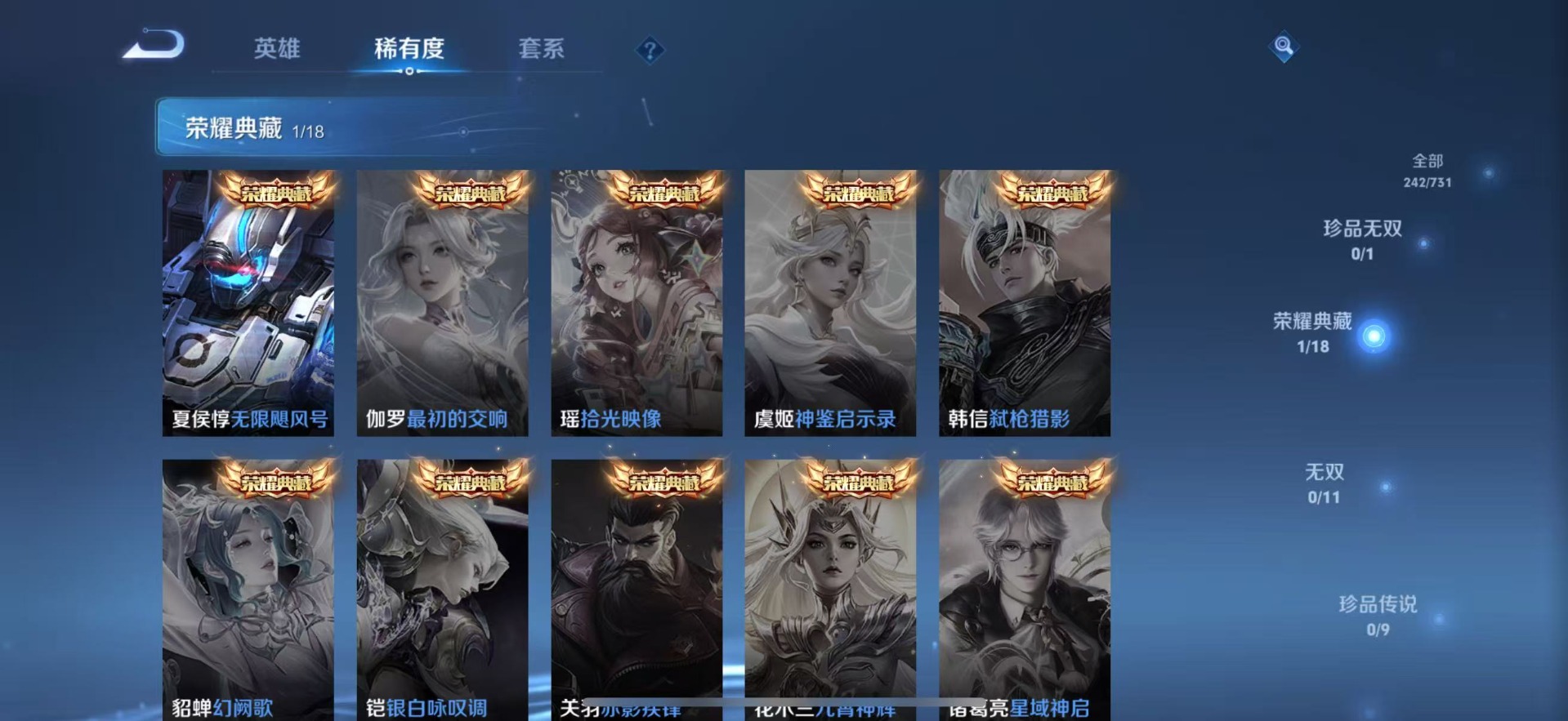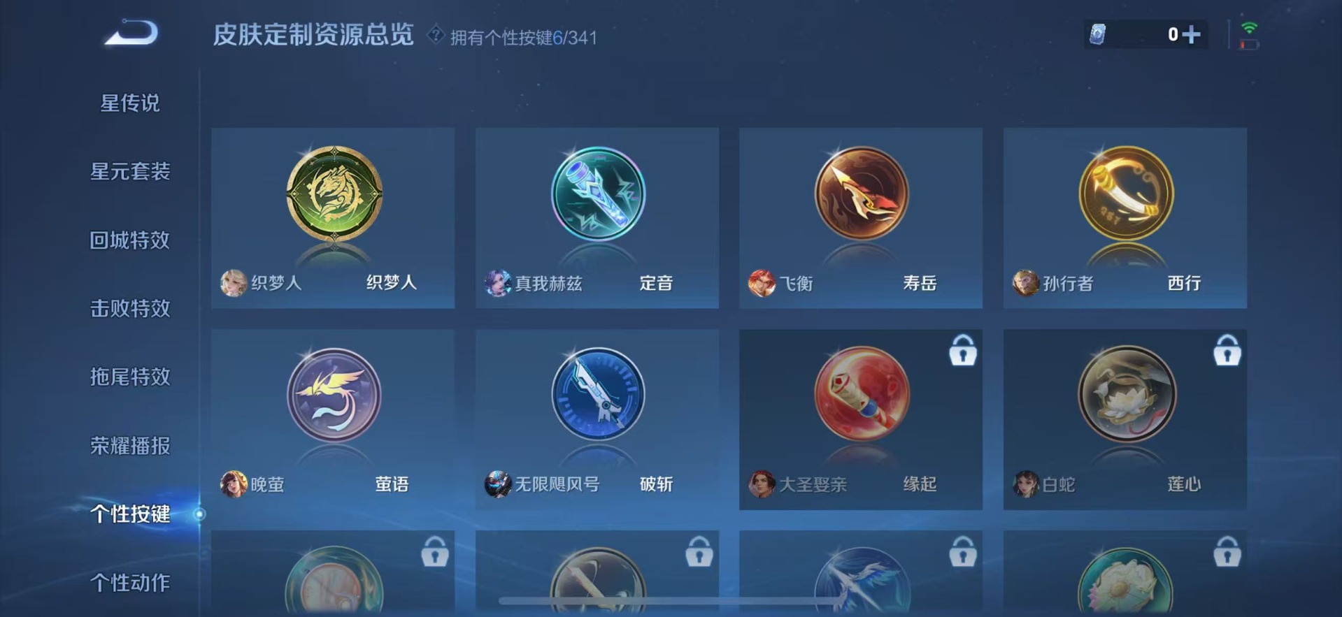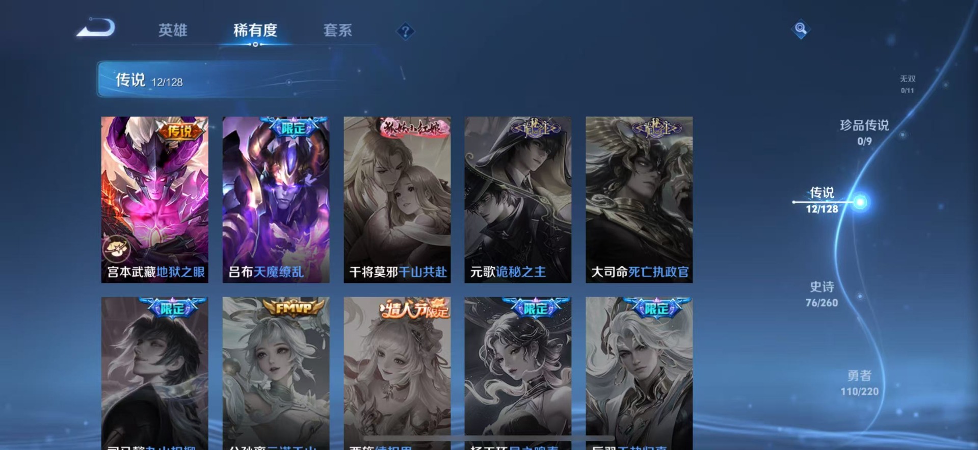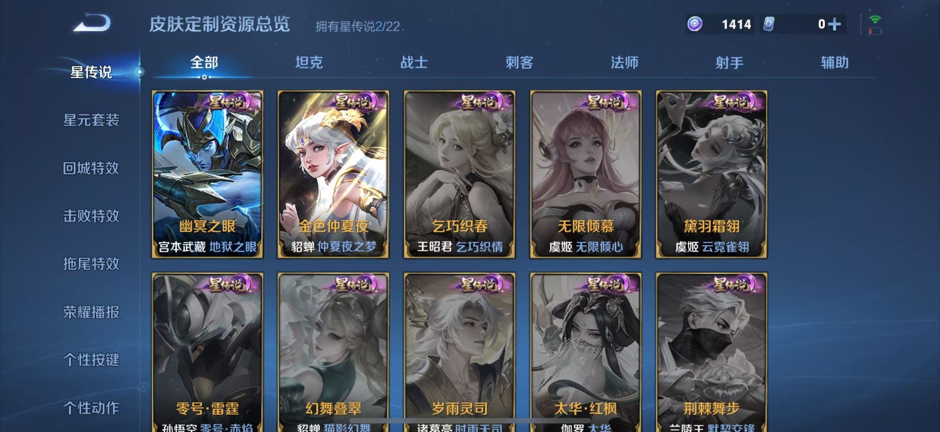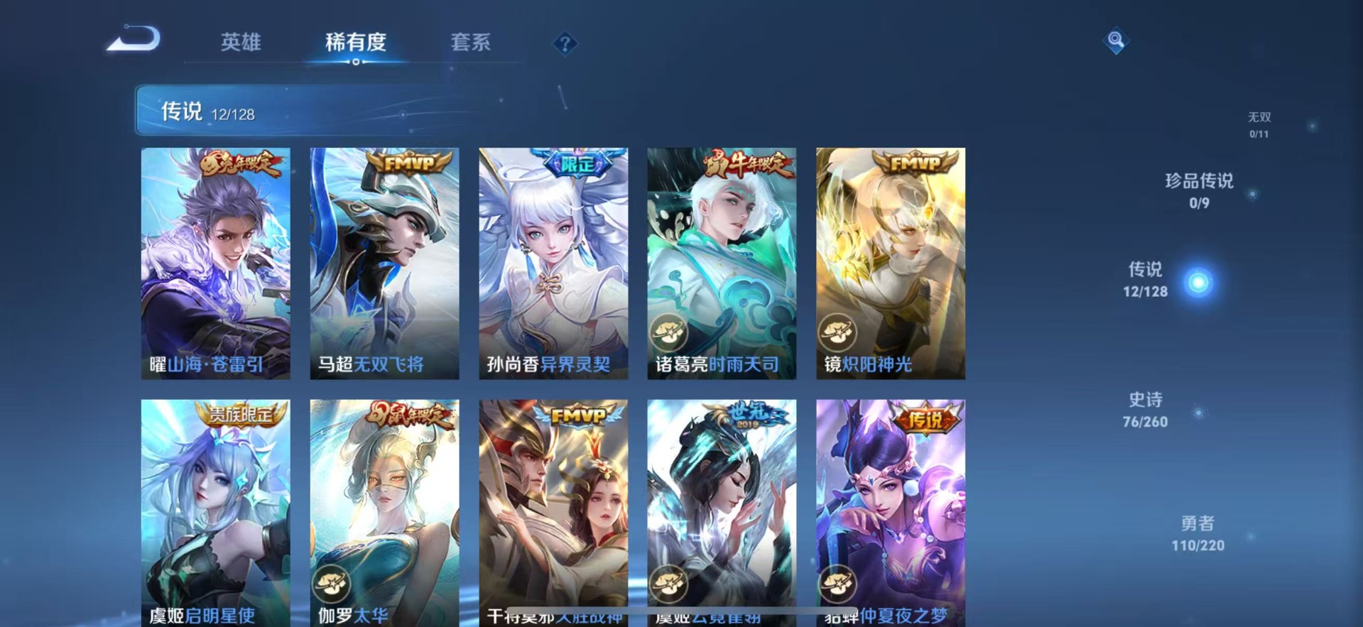 伽罗太华,孙尚香异界灵契,后羿如梦令,诸葛亮时雨天司,裴擒虎李小龙,孙悟空孙行者,孙悟空大圣娶亲,孙悟空至尊宝,赵云引擎之心,韩信飞衡,百里守约朱雀志,关羽冰锋战神
