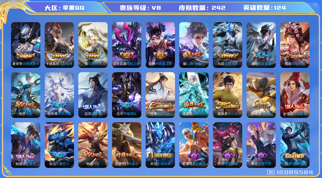 [12089584]V8 1典藏 12传说 124英雄 242皮肤 可修改实名 优质装备:无限飓风号(高达),久胜战神,炽阳神光,云霓雀翎,仲夏夜之梦(大飞蛾),地狱之眼,无双飞将,山海·苍雷引(电光曜子),涂山容容 珍宝阁皮:妄想食味,玩趣恶龙 限定皮:至尊宝,太华(伽罗年限),异界灵契(白毛香),时雨天司(水龙头),飞衡(韩信年限),高山流水,冰锋战神,游园惊梦,李小龙,朱雀志(守约年限),如梦令-后羿,孙行者,大圣娶亲,引擎之心,天魔缭乱 史诗皮:龙之律动,石田雨龙,百相守梦-黄忠,织梦人,苍穹之光,白龙吟,黄金分割率,特工魅影,千年之狐,永昼,江河有灵,真我赫兹(镜),魅语,蒙恬荣光圣徽,冰冠公主,偶像歌手,晚萤,暗夜猫娘,猫狗日记-孙策,时之恋人-孙尚香,修罗,女仆咖啡,水果甜心,绅士熊喵,天才门将,星夜王子,心灵骇客,时之奇旅-安琪拉,功夫厨神,暗隐猎兽者,幽灵船长,鬼剑武藏,心灵战警,舞动绿茵,纤云弄巧,繁星吟游(呼啦呼啦),拒霜思,缤纷独角兽,乘风破浪,逐浪之夏,水晶猎龙者,曙光守护者,金属风暴,原初追逐者,圣诞狂欢,圣诞恋歌,鹰眼统帅,魅力维加斯,未来纪元-赵云