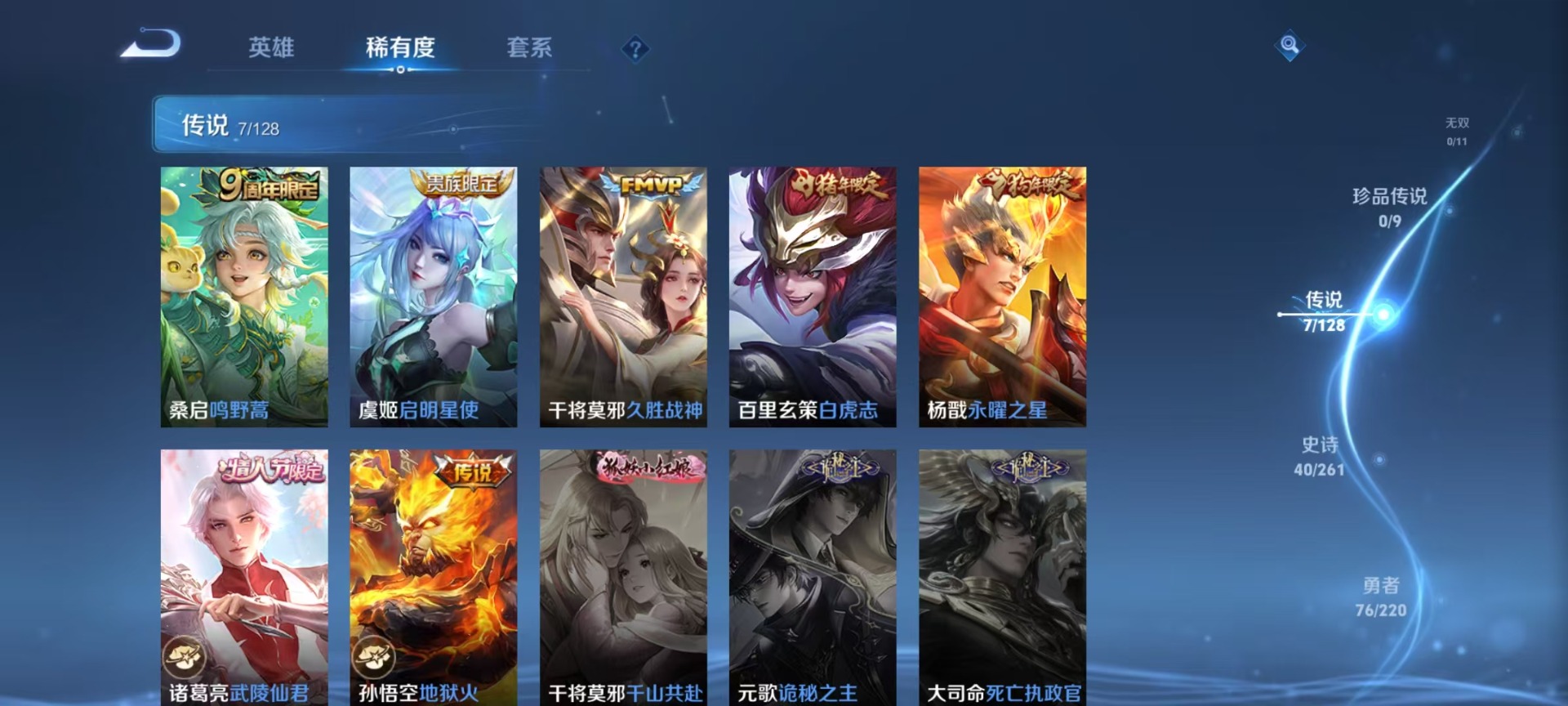 铠青龙志,典韦岱宗,吕布御风骁将,后羿辉光之辰,裴擒虎李小龙,东皇太一逐梦之光,上官婉儿梁祝,安琪拉魔法小厨娘,桑启鸣野蒿,孙悟空至尊宝,孙悟空美猴王,百里玄策白虎志,雅典娜神奇女侠,韩信飞衡,百里守约朱雀志