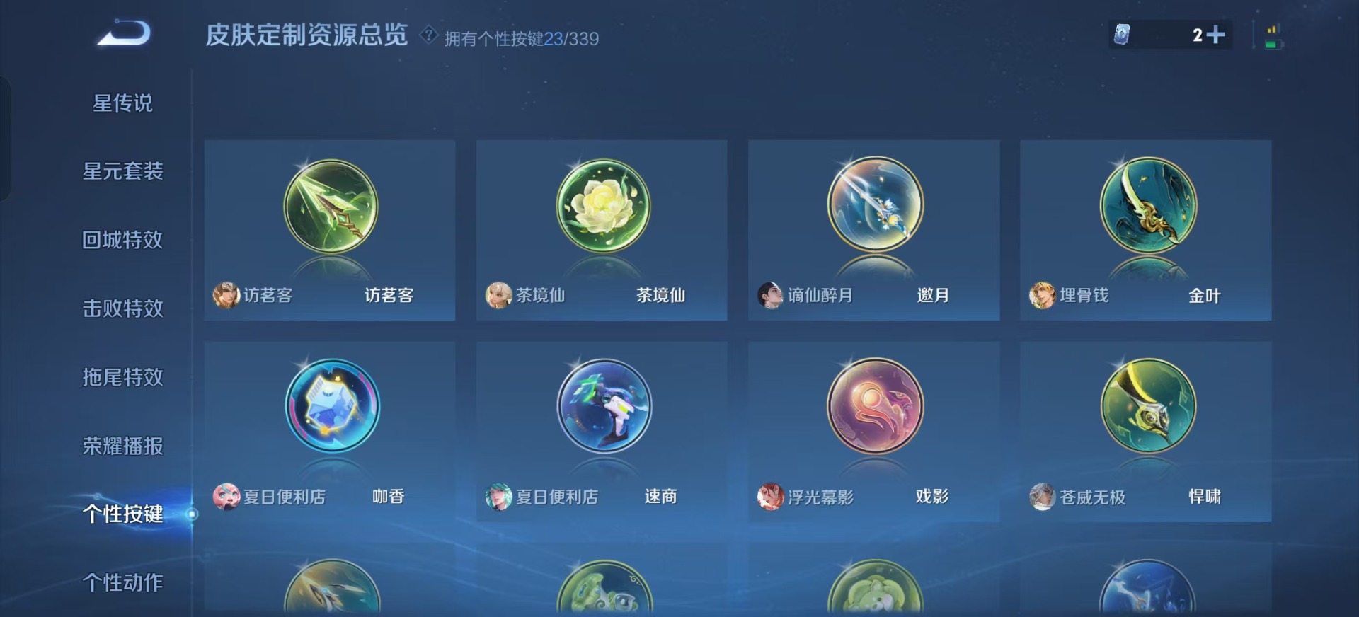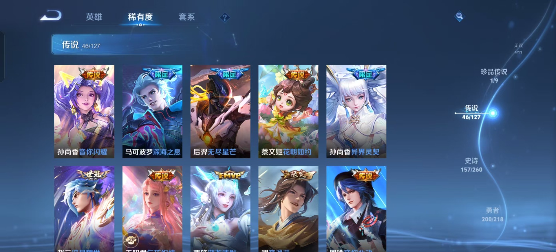 大乔白鹤梁神女,金蝉唐三藏,夏侯惇匿光决锋者,铠青龙志,盾山梦圆繁星,曹操天狼征服者,伽罗天狼溯光者,伽罗太华,苏烈玄武志,张飞虎魄,孙膑天狼运算者,典韦岱宗,孙尚香异界灵契,不知火舞绯月行,牛魔奔雷神使,鲁班七号乒乒小将,项羽霸王别姬,后羿无尽星芒,吕布御风骁将,后羿如梦令,后羿辉光之辰,诸葛亮时雨天司,裴擒虎李小龙,上官婉儿梁祝,上官婉儿神器·万象笔,上官婉儿天狼绘梦者,花木兰瑞麟志,安琪拉魔法小厨娘,马可波罗深海之息,桑启鸣野蒿,猪八戒猪悟能,孙悟空孙行者,孙悟空大圣娶亲,孙悟空至尊宝,芈月白晶晶,马超神威,雅典娜神奇女侠,赵云引擎之心,妲己时之奇旅,韩信飞衡,韩信逐梦之影,百里守约朱雀志,蔡文姬奇迹圣诞,虞姬霸王别姬,王昭君凤凰于飞,王昭君星穹之声,关羽武圣,关羽冰锋战神