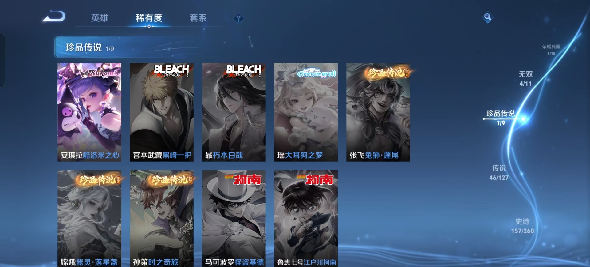 - PX_2072371-80 苹果QQ/至尊星耀/326皮肤/125英雄/1典藏/0珍品无双/0无双/4珍品传说/33传说/97史诗/9稀有英雄 【4 珍品传说】朽木白哉 暃,黑崎一护 宫本武藏,怪盗基德 马可波罗,江户川柯南 鲁班七号, 【1 典藏皮肤】九霄神辉 花木兰, 【33 传说皮肤】胖达荣荣 梦奇,启明星使 虞姬,碎云 百里守约,逐花归海 澜,电玩·雷克斯 澜,无双飞将 马超,补天 女娲,