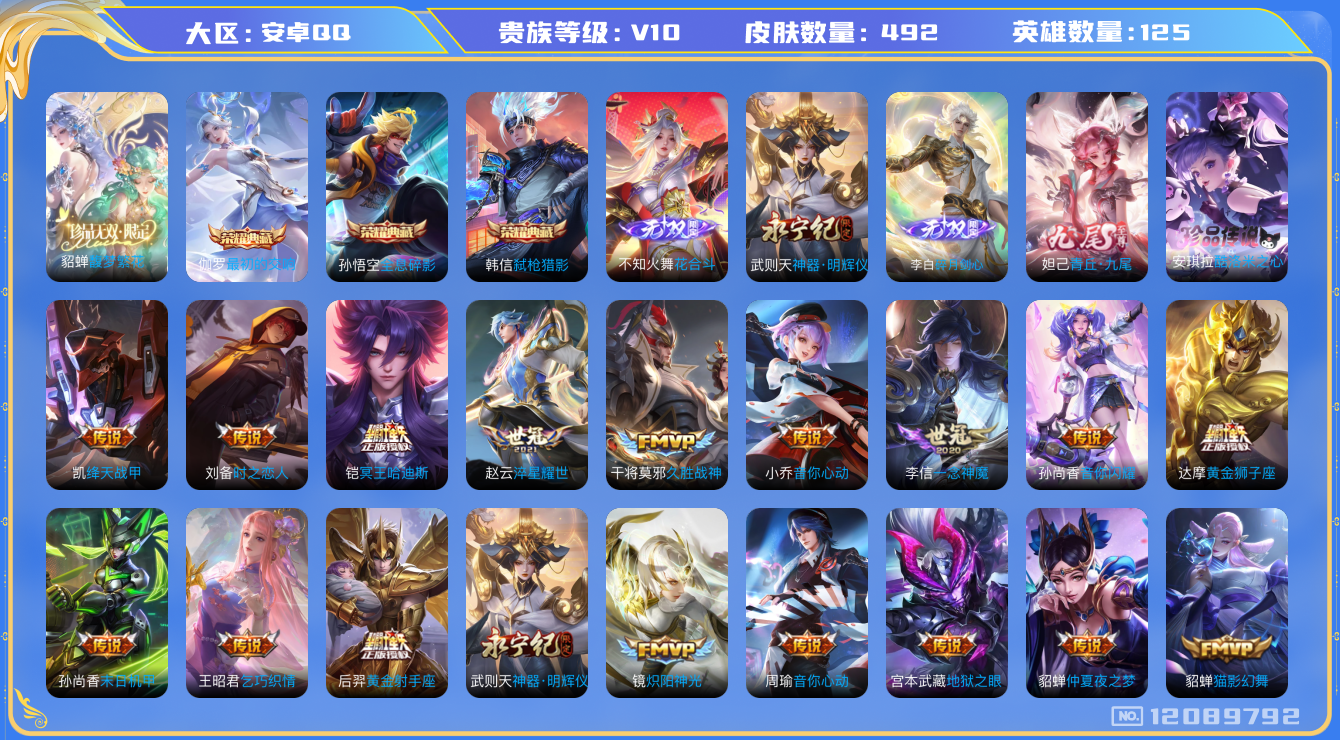 [12089792]V10 3典藏 1珍品无双 4无双 1珍品传说 46传说 125英雄 492皮肤 可修改实名 优质装备:馥梦繁花,全息碎影(猴子典藏),弑枪猎影(韩信典藏),神器·明辉仪,青丘·九尾(妲己无双),碎月剑心(李白无双),花合斗,最初的交响(伽罗典藏),酷洛米之心,黄金狮子座,黄金射手座,冠军飞将,云鹰飞将(小将军),绛天战甲(鸡嘴战神),黄金白羊座,猫影幻舞,久胜战神,炽阳神光,一念神魔,云霓雀翎,末日机甲-孙尚香(绿蚂蚱),地狱火,仲夏夜之梦(大飞蛾),音你心动-小乔,零号·赤焰,地狱之眼,音你心动-周瑜,李逍遥,乞巧织情,时之恋人-刘备(电焊工),游龙清影(小青龙),淬星耀世,超时空战士-狄仁杰,花朝如约(花篮子),音你闪耀(rap皮),神器·狴犴令,神器·明辉仪,青丘·九尾,电玩·雷克斯,艾琳觅芳踪,黄金天蝎座 传说皮:铠冥王哈迪斯,幻光神枪 珍宝阁皮:妄想食味,胡桃夹子,玩趣恶龙 限定皮:逐霄战戟,鸣野蒿,至尊宝,凤求凰(白切鸡),凤凰于飞,太华(伽罗年限),武陵仙君(小桃花),异界灵契(白毛香),星穹之声,绯月行,白鹤梁神女,魔法小厨娘,白晶晶,时雨天司(水龙头),神威(电光马子),飞衡(韩信年限),瑞麟志(木兰年限),高山流水,齐天大圣,匿光决锋者,五谷丰年,青龙志(铠年限),冰锋战神,武圣,天狼运算者,梁祝,御风骁将(吕布年限),岱宗(典韦年限),天狼溯光者,虎魄,天狼征服者,奔雷神使(牛魔年限),天狼绘梦者,李小龙,逐梦之影,玄武志(苏烈年限),朱雀志(守约年限),辉光之辰,如梦令-后羿,霸王别姬-项羽,霸王别姬-虞姬,奇迹圣诞,孙行者,猪悟能,大圣娶亲,引擎之心,天魔缭乱,乒乒小将,神奇女侠,无尽星芒,深海之息(深海大菠萝),唐三藏,时之奇旅-妲己,神器·万象笔,梦圆繁星 史诗皮:鸭鸭历险记-刘禅,化蝶舞,星界战将,灵蛊蚀心,龙之律动,小牛鸭,石田雨龙,茶境仙,破空之剑,东方月初,蒙犽顽岩魄,埋骨钱,芈月浮光幕影,怒海争锋,谪仙醉月,决胜骁骑,蔬乡物语(鲁班七号),琥珀纪元伽罗,百相守梦-百里守约,遇见神鹿,紫霞仙子,苍穹之光,电玩小子(小书包),白龙吟,黄金分割率,特工魅影,千年之狐,电玩·兔顽号,匿光破解者,百相守梦(刘备),百相守梦(关羽),电玩·爆裂旋风,浮梦罗烟,匿光侦查者,江河有灵,百解令(蒙犽),高渐离燃音魔法,银翎春语,偶像歌手