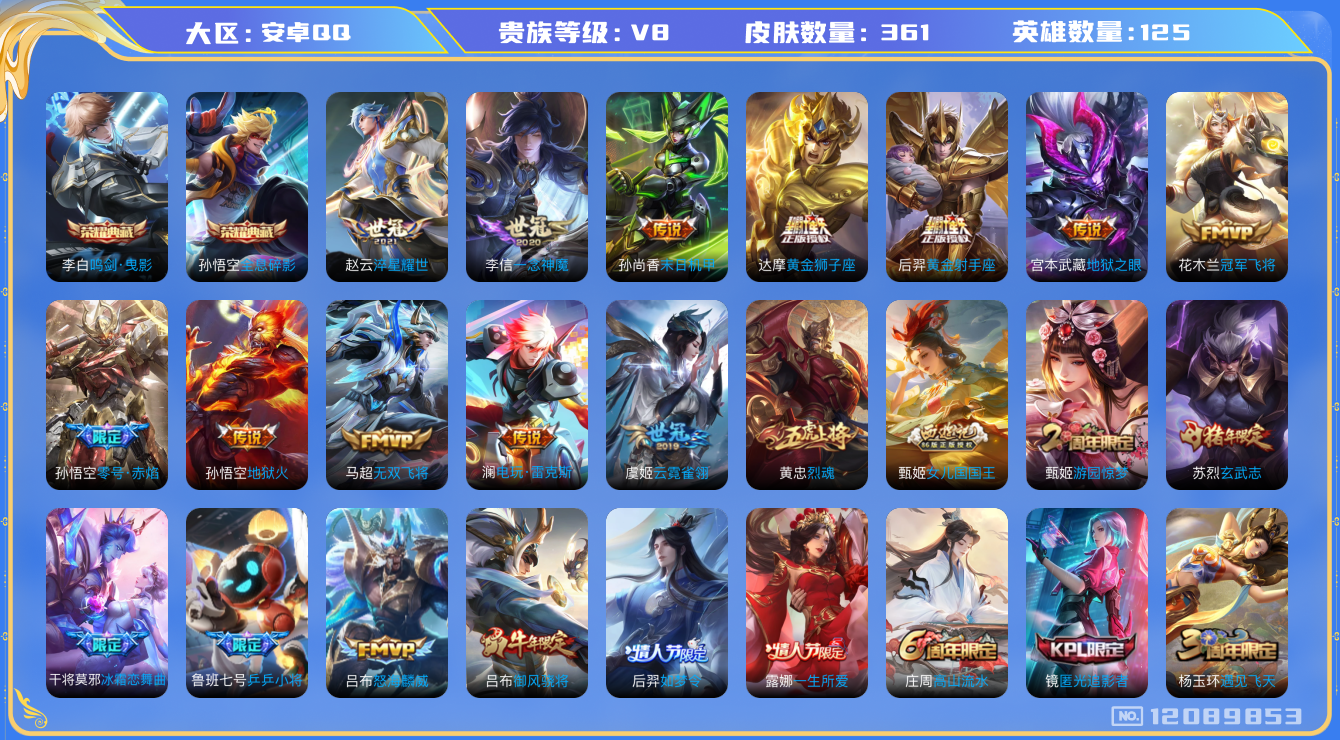 [12089853]V8 2典藏 18传说 125英雄 361皮肤 可修改实名 优质装备:鸣剑·曳影,全息碎影(猴子典藏),黄金狮子座,黄金射手座,冠军飞将,一念神魔,云霓雀翎,末日机甲-孙尚香(绿蚂蚱),地狱火,零号·赤焰,地狱之眼,淬星耀世,无双飞将,电玩·雷克斯 珍宝阁皮:蔷薇恋人,女武神,玩趣恶龙 限定皮:愿照·岁时盈(虞姬年限),鸣野蒿,至尊宝,白虎志(电光耗子),傲雪梅枪,飞衡(韩信年限),遇见飞天,高山流水,诗剑行,怒海麟威,五谷丰年,游园惊梦,梁祝,御风骁将(吕布年限),烈魂,李小龙,逐梦之影,玄武志(苏烈年限),如梦令-嫦娥,如梦令-后羿,霸王别姬-虞姬,孙行者,猪悟能,一生所爱,大圣娶亲,青春决赛季,冰霜恋舞曲,乒乒小将,美猴王,匿光追影者,女儿国国王,山海·玄木吟(马可年限) 史诗皮:鸭鸭历险记-刘禅,器灵·浮梦炉,狼魂孤将,化蝶舞,灵蛊蚀心,星界战将,龙之律动,怒海争锋,破空之剑,紫霞仙子,苍穹之光,电玩小子(小书包),白龙吟,黄金分割率,特工魅影,千年之狐,永昼,江河有灵,魅语,蒙恬荣光圣徽,偶像歌手,晚萤,电玩·爆裂旋风,暗夜猫娘,末日机甲-吕布,猫狗日记-孙策,乱世虎臣,节奏热浪,修罗,女仆咖啡,摇滚巨星,水果甜心,绅士熊喵,天才门将,星夜王子,心灵骇客,功夫厨神,德古拉伯爵,暗隐猎兽者,幽灵船长,鬼剑武藏,心灵战警,乐园奇幻夜,天秀·启明,舞动绿茵,地狱岩魂,纤云弄巧,繁星吟游(呼啦呼啦),拒霜思,缤纷独角兽,乘风破浪,逐浪之夏,月团寄思,水晶猎龙者,曙光守护者,箭羽风息,金属风暴,原初追逐者,圣诞狂欢,圣诞恋歌,鹰眼统帅,王者之锤,暗夜贵公子,魅力维加斯,黎明之约,无心,未来纪元-赵云