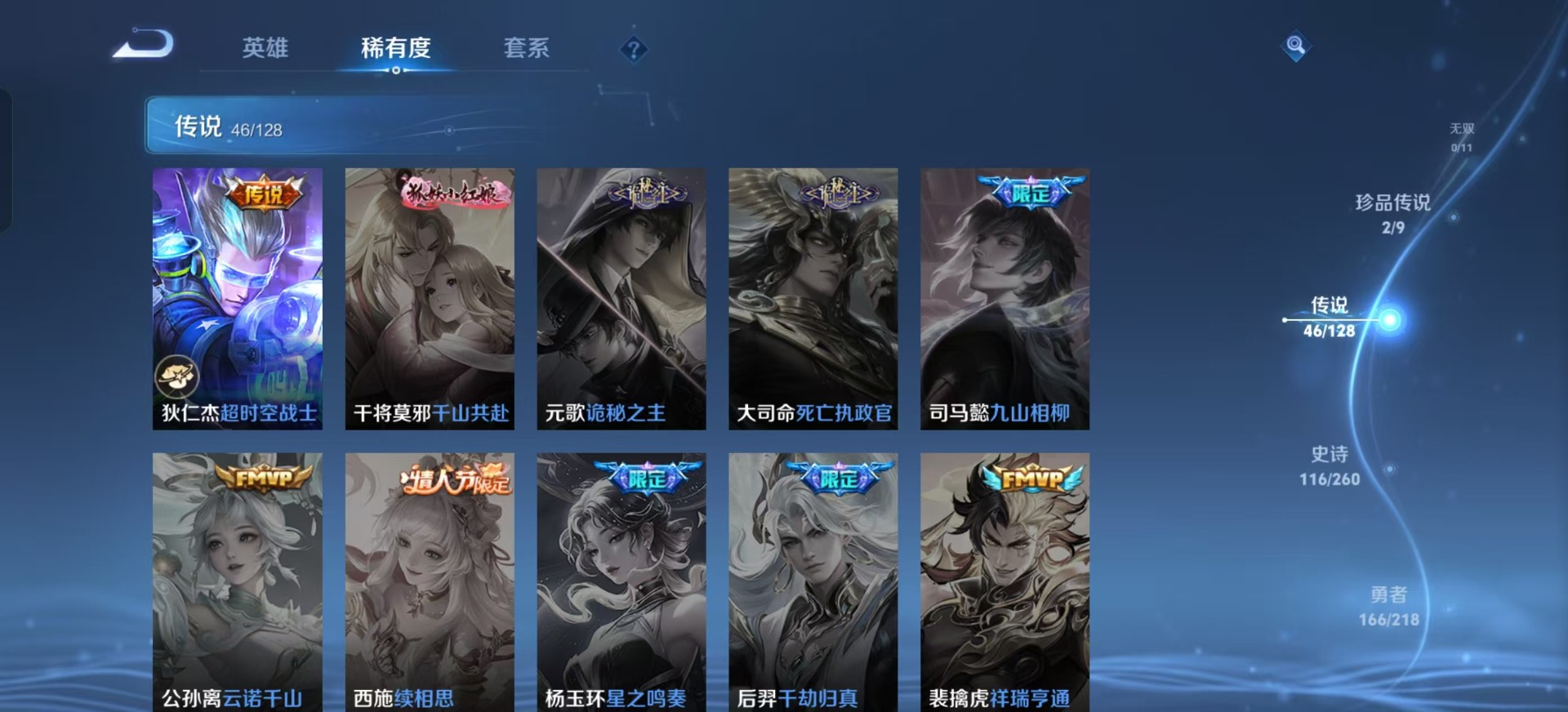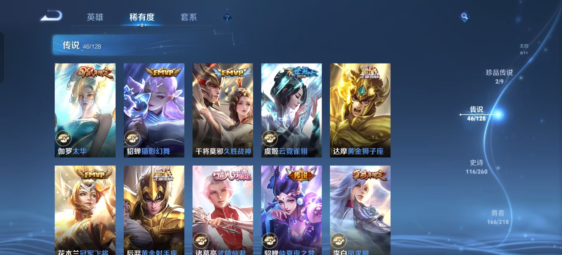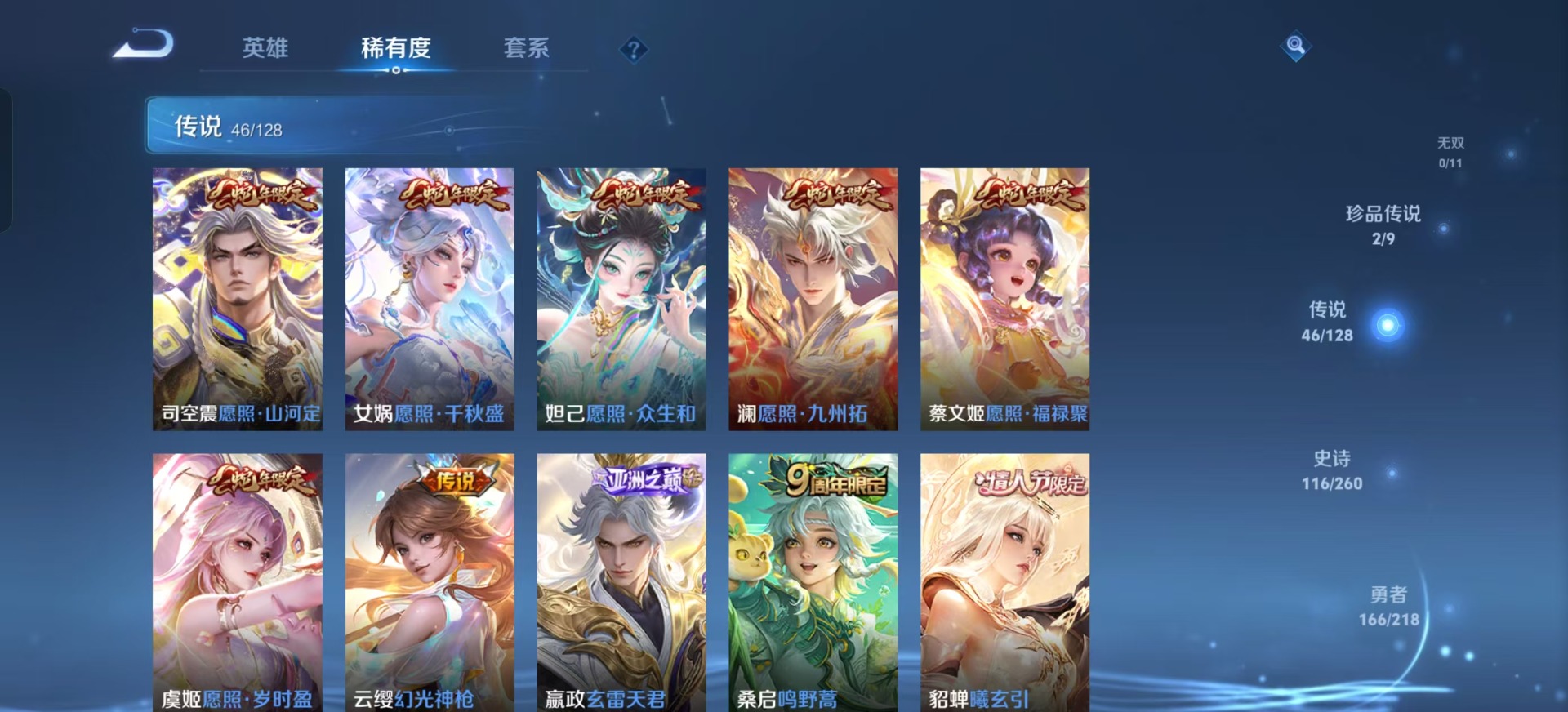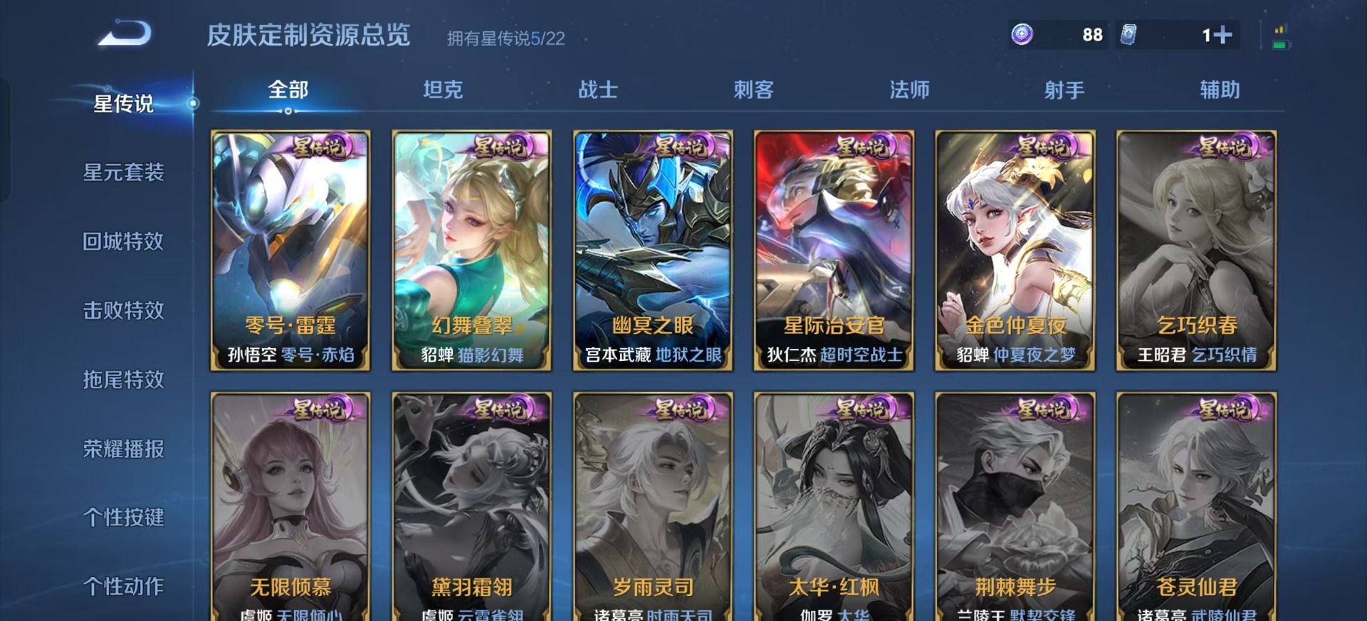 曹操天狼征服者,伽罗天狼溯光者,伽罗太华,孙膑天狼运算者,后羿辉光之辰,司空震愿照·山河定,裴擒虎李小龙,上官婉儿梁祝,李白诗剑行,安琪拉魔法小厨娘,马可波罗逐梦之星,艾琳陌上桑,桑启鸣野蒿,女娲愿照·千秋盛,孙悟空孙行者,孙悟空大圣娶亲,孙悟空至尊宝,孙悟空美猴王,妲己愿照·众生和,韩信飞衡,蔡文姬愿照·福禄聚,澜愿照·九州拓,虞姬愿照·岁时盈,妲己热情桑巴,关羽冰锋战神