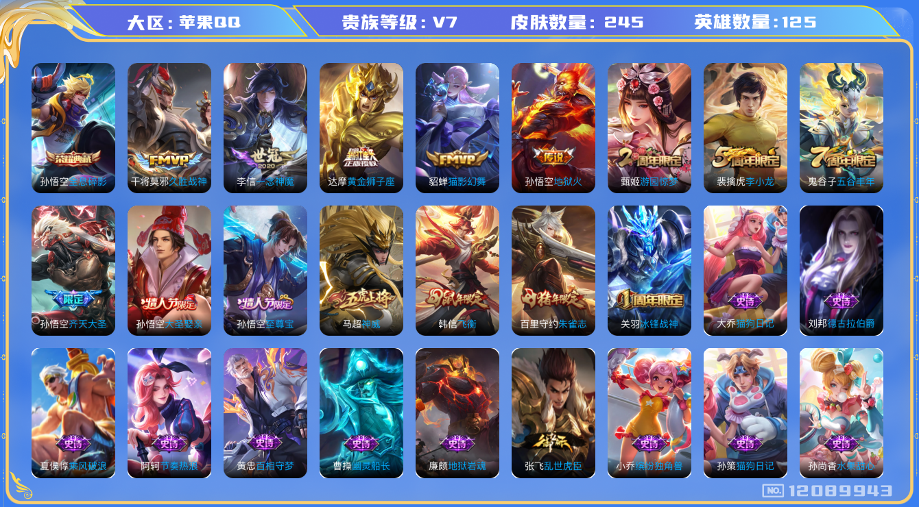 [12089943]V7 1典藏 6传说 125英雄 245皮肤 可修改实名 优质装备:全息碎影(猴子典藏),黄金狮子座,猫影幻舞,久胜战神,一念神魔,地狱火 珍宝阁皮:女武神 限定皮:至尊宝,神威(电光马子),飞衡(韩信年限),齐天大圣,五谷丰年,冰锋战神,游园惊梦,李小龙,朱雀志(守约年限),大圣娶亲 史诗皮:灵蛊蚀心,星界战将,百相守梦-黄忠,紫霞仙子,黄金分割率,千年之狐,魅语,蒙恬荣光圣徽,无限星赏官,冰冠公主,偶像歌手,末日机甲-吕布,猫狗日记-孙策,猫狗日记-大乔,乱世虎臣,节奏热浪,修罗,女仆咖啡,摇滚巨星,水果甜心,天才门将,星夜王子,功夫厨神,德古拉伯爵,暗隐猎兽者,幽灵船长,鬼剑武藏,地狱岩魂,纤云弄巧,缤纷独角兽,乘风破浪,逐浪之夏,水晶猎龙者,金属风暴,原初追逐者,圣诞狂欢,圣诞恋歌,鹰眼统帅,暗夜贵公子,魅力维加斯,黎明之约,未来纪元-赵云