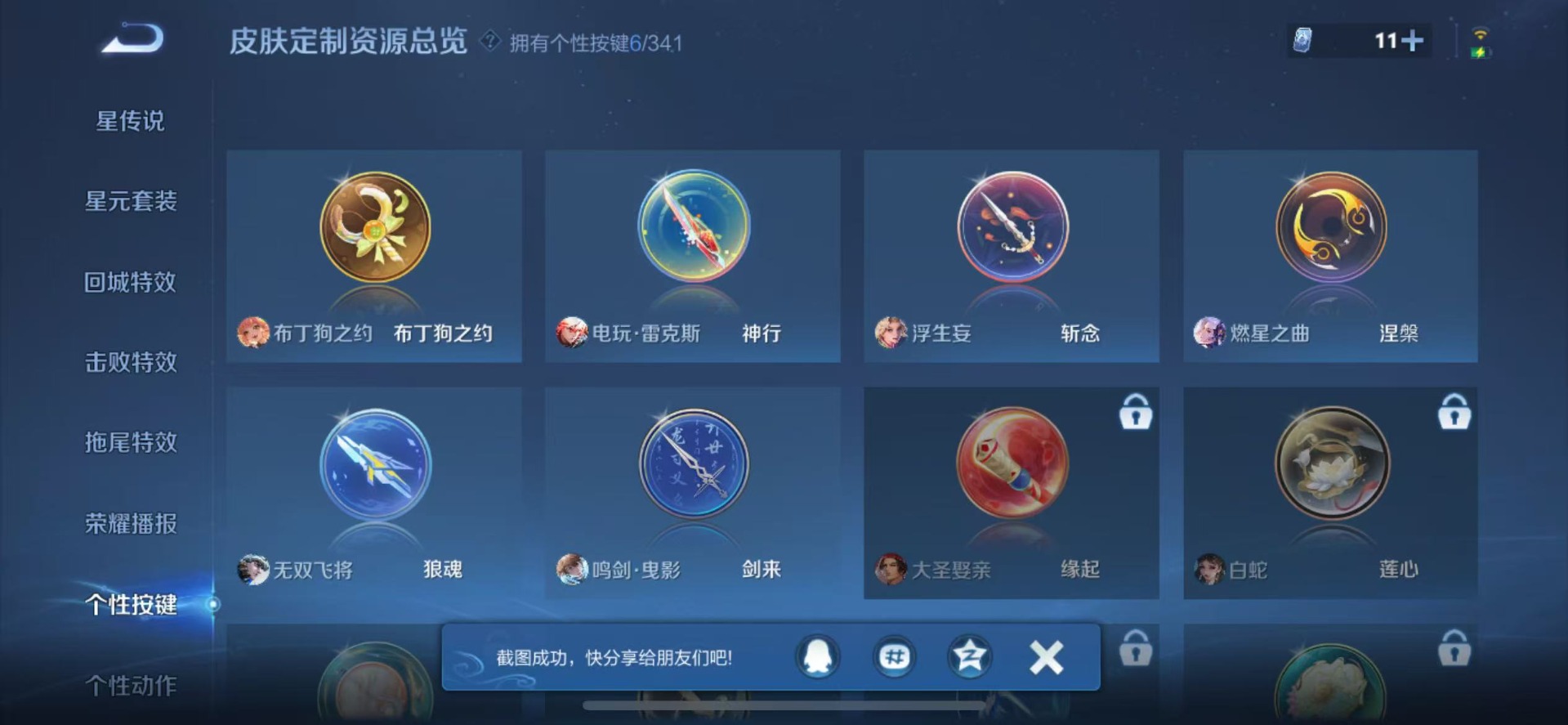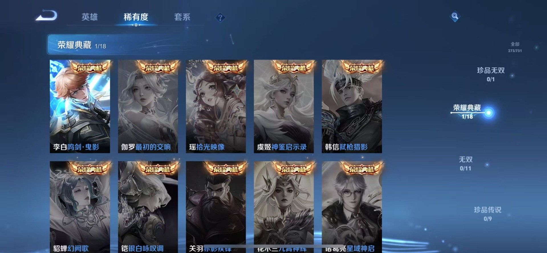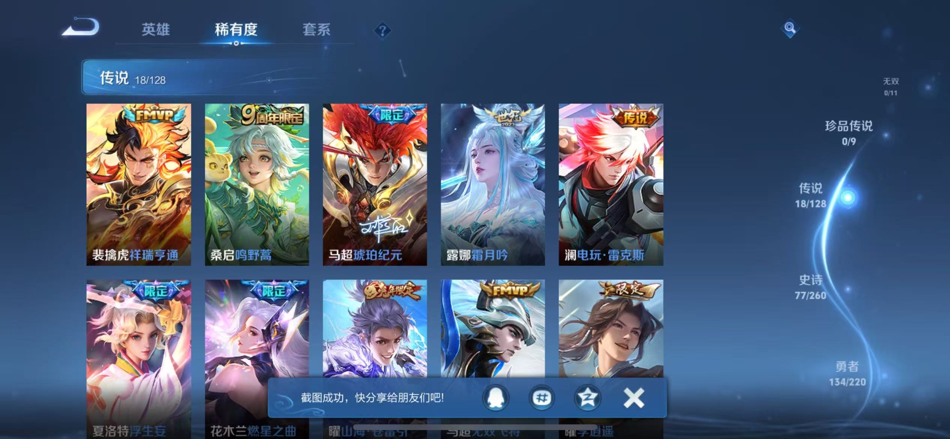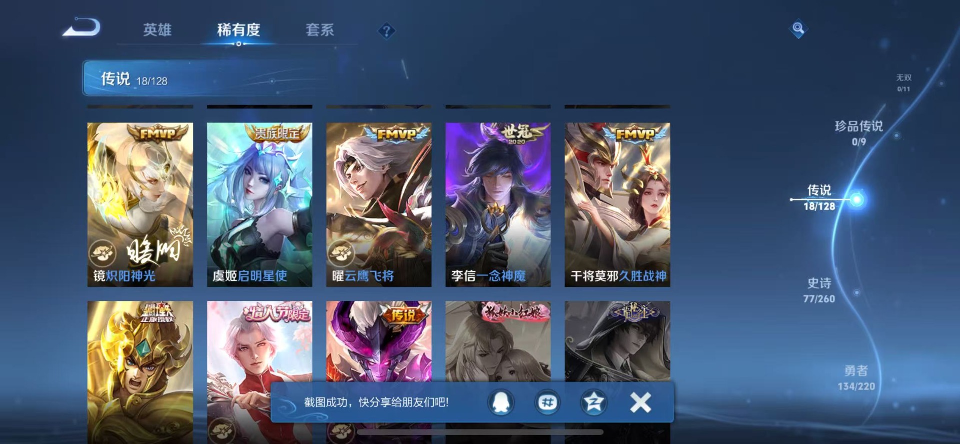 干将莫邪久胜战神,李信一念神魔,达摩黄金狮子座,露娜霜月吟,镜炽阳神光,裴擒虎祥瑞亨通,夏洛特浮生妄,曜云鹰飞将,曜李逍遥,马超琥珀纪元,马超无双飞将