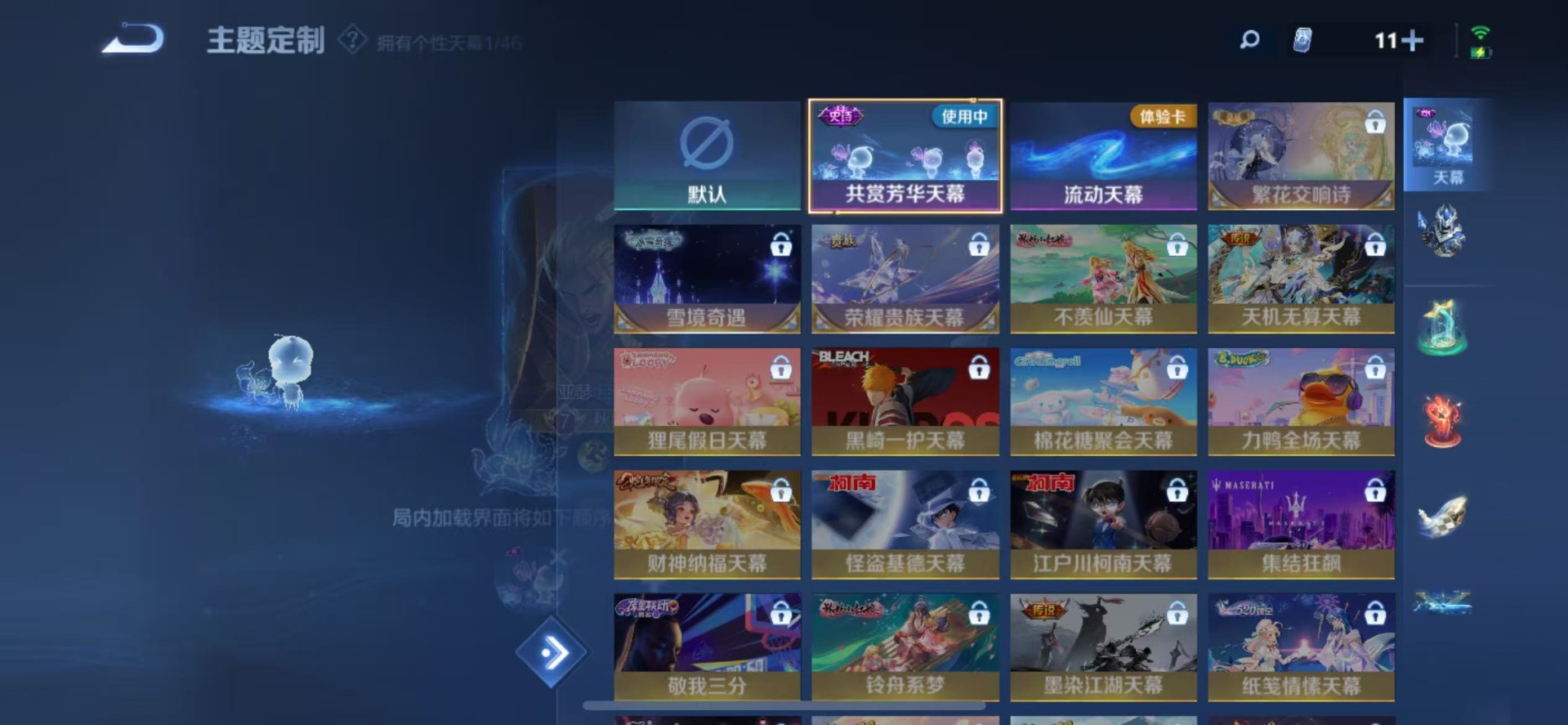 大乔猫狗日记,刘邦德古拉伯爵,阿轲节奏热浪,铠曙光守护者,曹操幽灵船长,廉颇地狱岩魂,孙策猫狗日记,不知火舞魅语,赵怀真鹤归松栖,鲁班七号电玩小子,项羽苍穹之光,吕布圣诞狂欢,露娜紫霞仙子,镜玫瑰异探,镜真我赫兹,刘禅电玩·爆裂旋风,刘禅天才门将,宫本武藏鬼剑武藏,兰陵王暗隐猎兽者,貂蝉圣诞恋歌,花木兰水晶猎龙者,李白千年之狐,上官婉儿群星魔术团,安琪拉心灵骇客,杨戬天秀·启明,白起星夜王子,亚瑟心灵战警,嬴政摇滚巨星,百里玄策原初追逐者,雅典娜黎明之约,百里守约特工魅影,李元芳逐浪之夏,墨子龙骑士,墨子金属风暴,娜可露露晚萤,王昭君偶像歌手,嫦娥拒霜思,橘右京修罗
