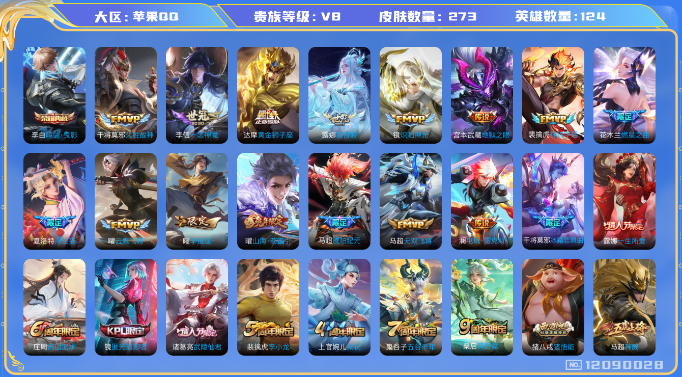 [12090028]V8 1典藏 18传说 124英雄 273皮肤 可修改实名 优质装备:鸣剑·曳影,黄金狮子座,云鹰飞将(小将军),久胜战神,炽阳神光,一念神魔,地狱之眼,李逍遥,无双飞将,山海·苍雷引(电光曜子),燃星之曲,浮生妄,电玩·雷克斯,霜月吟,琥珀纪元马超 传说皮:祥瑞亨通 珍宝阁皮:妄想食味,蔷薇恋人,玩趣恶龙 限定皮:鸣野蒿,武陵仙君(小桃花),神威(电光马子),飞衡(韩信年限),高山流水,五谷丰年,冰锋战神,梁祝,李小龙,猪悟能,一生所爱,冰霜恋舞曲,匿光追影者 史诗皮:星界战将,石田雨龙,茶境仙,怒海争锋,破空之剑,上官婉儿群星魔术团,百相守梦-百里守约,星界特工,百相守梦-黄忠,紫霞仙子,苍穹之光,电玩小子(小书包),特工魅影,千年之狐,鹤归松栖(赵怀真),真我赫兹(镜),魅语,蒙恬荣光圣徽,偶像歌手,晚萤,电玩·爆裂旋风,龙骑士(小龙虾),猫狗日记-孙策,猫狗日记-大乔,乱世虎臣,节奏热浪,修罗,女仆咖啡,摇滚巨星,水果甜心,天才门将,星夜王子,心灵骇客,德古拉伯爵,暗隐猎兽者,幽灵船长,鬼剑武藏,心灵战警,天秀·启明,地狱岩魂,纤云弄巧,繁星吟游(呼啦呼啦),拒霜思,逐浪之夏,月团寄思,水晶猎龙者,曙光守护者,金属风暴,原初追逐者,圣诞狂欢,圣诞恋歌,鹰眼统帅,黎明之约,未来纪元-赵云,玫瑰异探