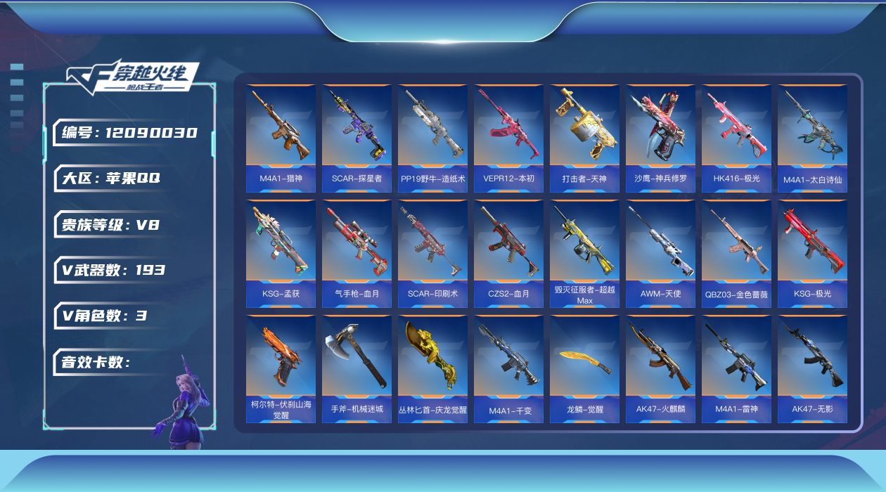 [12090030]V8 可二次 可修改实名 V8 4王者武器 193英雄武器 3英雄角色 379万化 枪王SS 英雄武器:M200-幻神,AK47-孟德,VEPR12-本初,M4A1-星象,TAC-慈,81式-光明之神,MK47-云舞,KSG-孟获,加特林-炼狱,COP 357-星象,COP 357-堕天神,COP 357-雷霆,巴雷特-金色蔷薇,巴雷特-极光,巴雷特-毁灭,AK47-黑武士觉醒,AK47-火麒麟,AK47-无影,M4A1-竞界荣光,M4A1-雷神,M4A1-黑龙,M4A1-黑骑士,AWM-天使,98K-黑骑士,QBZ03-金色蔷薇,AWM-游骑兵,9A91-游骑兵,AUG-机械纪元,MK5-极光,KSG-黑骑士,AK47-亚龙,AK47-猩红传说,M4A1-龙血,M4A1-猎神,M4A1-千变,M200-心动次元觉醒,09式狙-天神,AWM-裁决,98K-血月,AK12-天启,AWM-天龙,剑齿虎,SCAR-探星者,MK47-鼓龙,黑龙魂,A180-地狱凤凰,PP19野牛-造纸术,嗜血金鲨,地狱烈炎,CZS2-血月,打击者-天神,KSG-火力竞放觉醒,KSG-极光,毁灭征服者-超越Max,SCAR-印刷术,HK416-极光,M4A1-太白诗仙,尼泊尔-星象,双持柯尔特-极光,沙鹰-无影,沙鹰-幻兽,气手枪-血月,沙鹰-神兵修罗,马来剑-毁灭,斩魔剑-天使,手斧-机械迷城,战斧-无影,柯尔特-伏刹山海觉醒,沙鹰-天神,麒麟刺,龙鳞-觉醒,弑魔者,神罚战斧,丛林匕首-庆龙觉醒,屠龙,龙啸