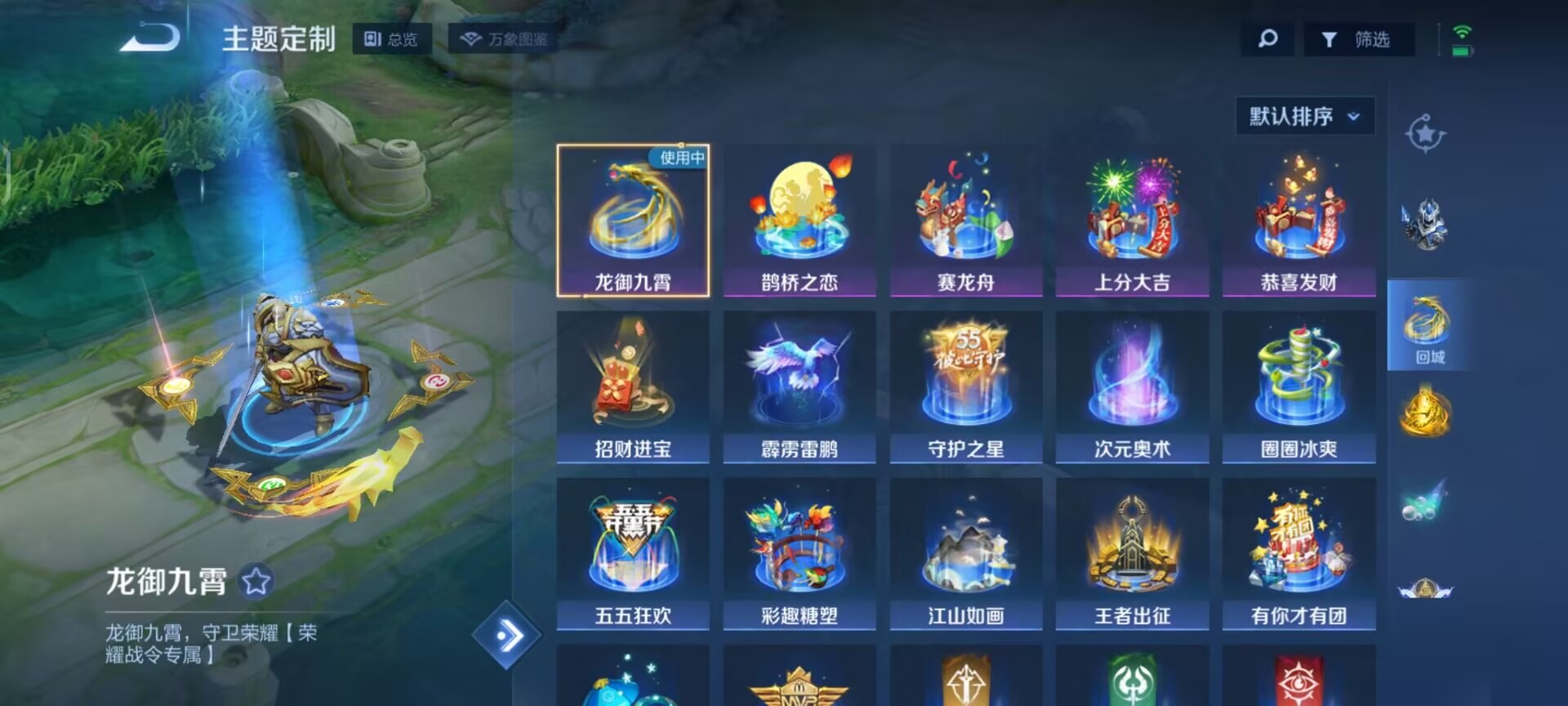 夏侯惇朔风刀,老夫子醍醐杖,沈梦溪星空之诺,沈梦溪大漠名商,盾山御銮,曹操烛龙,典韦穷奇,典韦蓝屏警告,牛魔御旌,鲁班七号狮舞东方,吕布猎兽之王,兰陵王金庭之子,鲁班大师探海日志,明世隐疑决卦,蒙犽狂想玩偶喵,白起狰,鬼谷子原初探秘者,张良古海寻踪,女娲朔望之晖,桑启海盐诗旅,狄仁杰万华元夜,嬴政白昼王子,芈月重明,程咬金演武夺筹,李元芳银河之约,弈星混沌棋,米莱狄御霄,钟馗神迹守卫,钟馗驱傩正仪,狂铁御狮,太乙真人饕餮