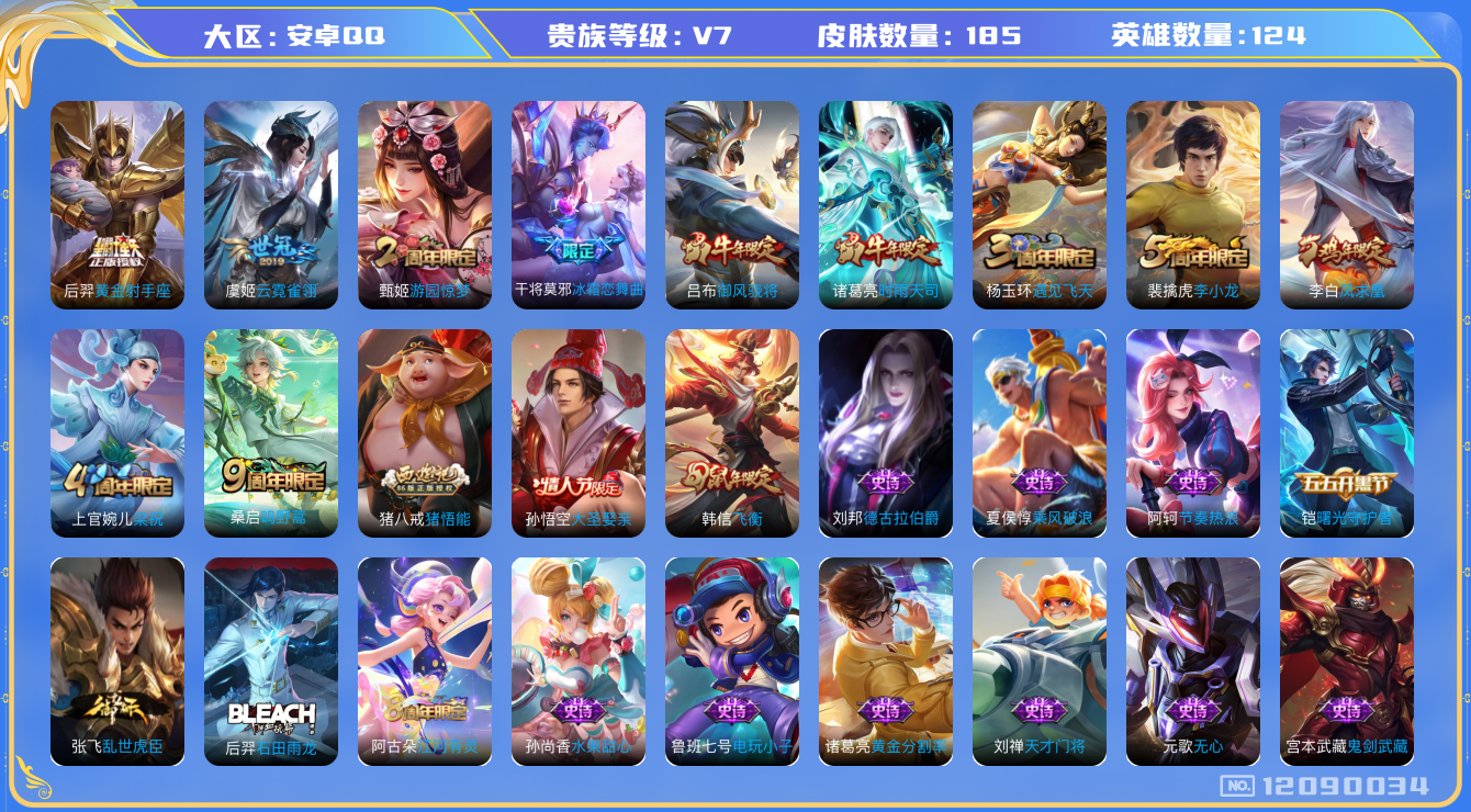 - [12296925]V7 1典藏 11传说 124英雄 334皮肤 可修改实名 优质装备:赤影疾锋,云鹰飞将(小将军),一念神魔,末日机甲-孙尚香(绿蚂蚱),淬星耀世,超时空战士-狄仁杰,涂山容容 传说皮:幻光神枪 珍宝阁皮:女武神,玩趣恶龙 限定皮:鸣野蒿,神威(电光马子),飞衡(韩信年限),影龙天霄,遇见飞天,高山流水,齐天大圣,降魔,五谷丰年,冰锋战神,武圣,游园惊梦,梁祝,天狼狩猎者,李小龙,永曜之星,霸王别姬-虞姬,孙行者,大圣娶亲,匿光追影者,寅虎·心曲(虎婆),天降福星 史诗皮:鸭鸭历险记-刘禅,灵蛊蚀心,星界战将,龙之律动,藏狐·褐绒,百相守梦-周瑜,怒海争锋,琥珀纪元伽罗,百相守梦-黄忠,守夜人,苍穹之光,电玩小子(小书包),黄金分割率,特工魅影,千年之狐,江河有灵,魅语,蒙恬荣光圣徽,冰冠公主,偶像歌手,白蛇,晚萤,龙骑士(小龙虾),末日机甲-吕布,猫狗日记-孙策,乱世虎臣,节奏热浪,修罗,女仆咖啡,摇滚巨星,水果甜心,绅士熊喵,天才门将,星夜王子,心灵骇客,功夫厨神,德古拉伯爵,暗隐猎兽者,幽灵船长,鬼剑武藏,心灵战警,舞动绿茵,地狱岩魂,纤云弄巧,繁星吟游(呼啦呼啦),缤纷独角兽,乘风破浪,逐浪之夏,水晶猎龙者,曙光守护者,箭羽风息,金属风暴,原初追逐者,圣诞狂欢,圣诞恋歌,鹰眼统帅,王者之锤,魅力维加斯,黎明之约,未来纪元-赵云