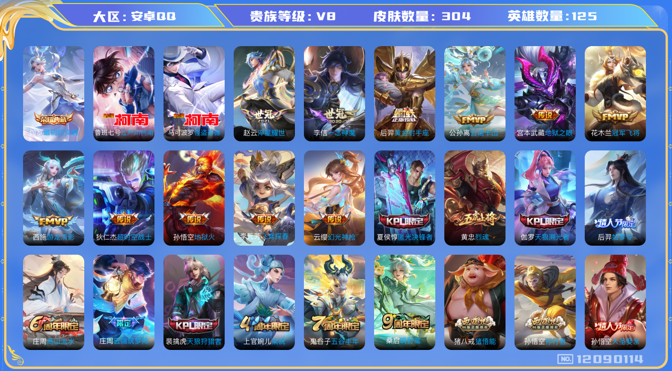 [12090114]V8 1典藏 2珍品传说 14传说 125英雄 304皮肤 可修改实名 优质装备:最初的交响(伽罗典藏),江户川柯南,怪盗基德,黄金射手座,冠军飞将,一念神魔,地狱火,地狱之眼,飞鸢探春,游龙清影(小青龙),淬星耀世,超时空战士-狄仁杰 传说皮:云诺千山,幻光神枪 珍宝阁皮:优雅恋人,蔷薇恋人,玩趣恶龙 限定皮:愿照·岁时盈(虞姬年限),鸣野蒿,至尊宝,高山流水,匿光决锋者,五谷丰年,梁祝,天狼狩猎者,烈魂,天狼溯光者,朱雀志(守约年限),如梦令-后羿,孙行者,猪悟能,大圣娶亲,云端筑梦师 史诗皮:灵蛊蚀心,谪仙醉月,龙之律动,芈月浮光幕影,蔬乡物语(鲁班七号),百相守梦-黄忠,遇见神鹿,紫霞仙子,苍穹之光,电玩小子(小书包),黄金分割率,特工魅影,永昼,魅语,高渐离燃音魔法,无限星赏官,冰冠公主,晚萤,龙骑士(小龙虾),末日机甲-吕布,猫狗日记-孙策,时之恋人-孙尚香,乱世虎臣,节奏热浪,修罗,女仆咖啡,摇滚巨星,水果甜心,绅士熊喵,天才门将,星夜王子,时之奇旅-安琪拉,功夫厨神,德古拉伯爵,暗隐猎兽者,幽灵船长,鬼剑武藏,心灵战警,地狱岩魂,拒霜思,缤纷独角兽,乘风破浪,逐浪之夏,龙鼓争鸣,月团寄思,水晶猎龙者,曙光守护者,热力回旋,箭羽风息,金属风暴,圣诞狂欢,圣诞恋歌,鹰眼统帅,魅力维加斯,无心,未来纪元-赵云