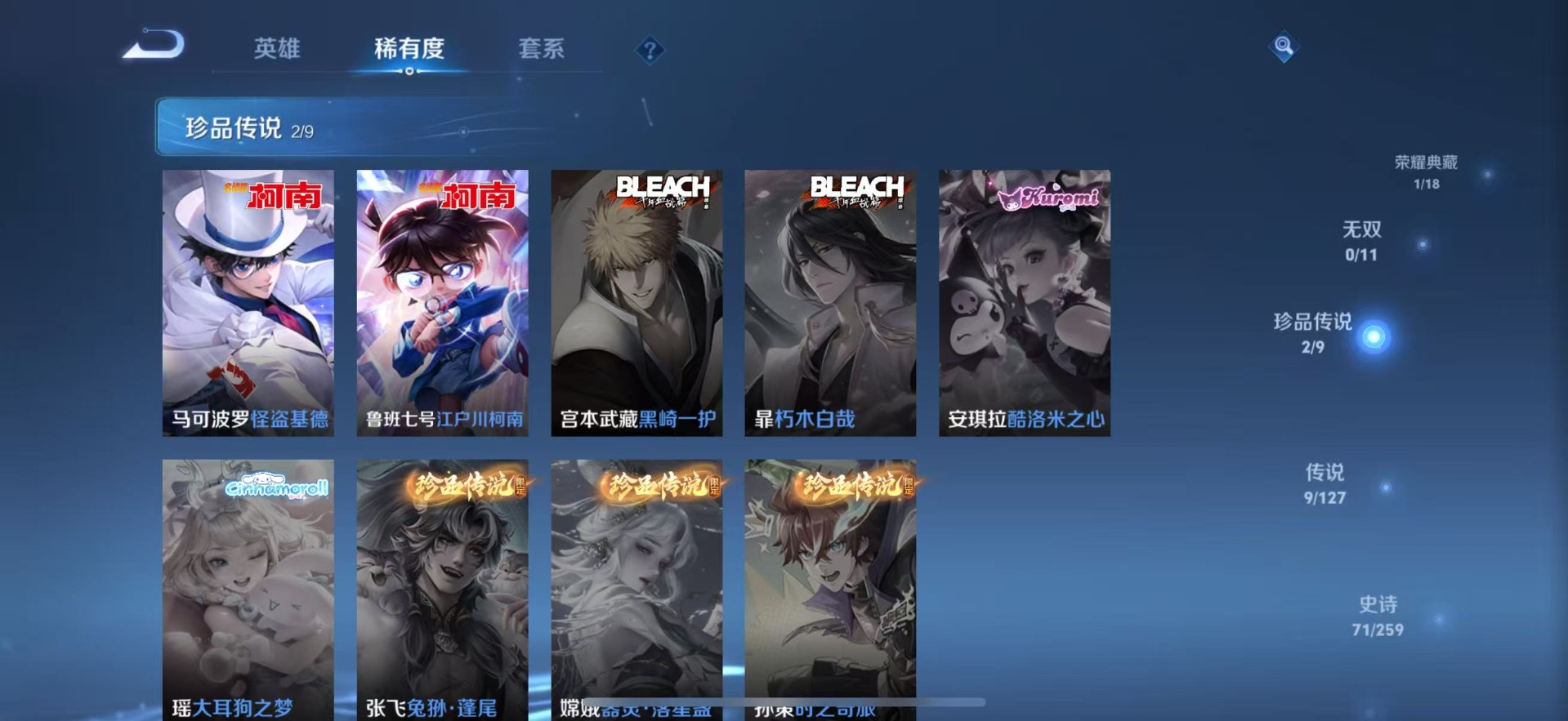 [12090119]V7 1典藏 2珍品传说 9传说 124英雄 289皮肤 可修改实名 优质装备:鸣剑·曳影,江户川柯南,怪盗基德,黄金狮子座,炽阳神光,末日机甲-孙尚香(绿蚂蚱),地狱之眼,惊梅引 传说皮:幻光神枪 珍宝阁皮:妄想食味,蔷薇恋人,玩趣恶龙 限定皮:愿照·九州拓(澜年限),逐霄战戟,鸣野蒿,时雨天司(水龙头),高山流水,五谷丰年,梁祝,李小龙,猪悟能,匿光追影者,玉兔公主,山海·玄木吟(马可年限) 史诗皮:星界战将,怒海争锋,战舞者,蒙犽顽岩魄,百相守梦-百里守约,紫霞仙子,特工魅影,千年之狐,永昼,江河有灵,雪夜绮愿(周瑜),蒙恬荣光圣徽,偶像歌手,电玩·爆裂旋风,末日机甲-吕布,猫狗日记-孙策,猫狗日记-大乔,乱世虎臣,节奏热浪,女仆咖啡,摇滚巨星,水果甜心,星夜王子,心灵骇客,功夫厨神,德古拉伯爵,暗隐猎兽者,幽灵船长,鬼剑武藏,暗渊魔法,心灵战警,地狱岩魂,纤云弄巧,拒霜思,缤纷独角兽,乘风破浪,逐浪之夏,水晶猎龙者,曙光守护者,箭羽风息,金属风暴,原初追逐者,圣诞狂欢,鹰眼统帅,魅力维加斯,黎明之约,无心,未来纪元-赵云