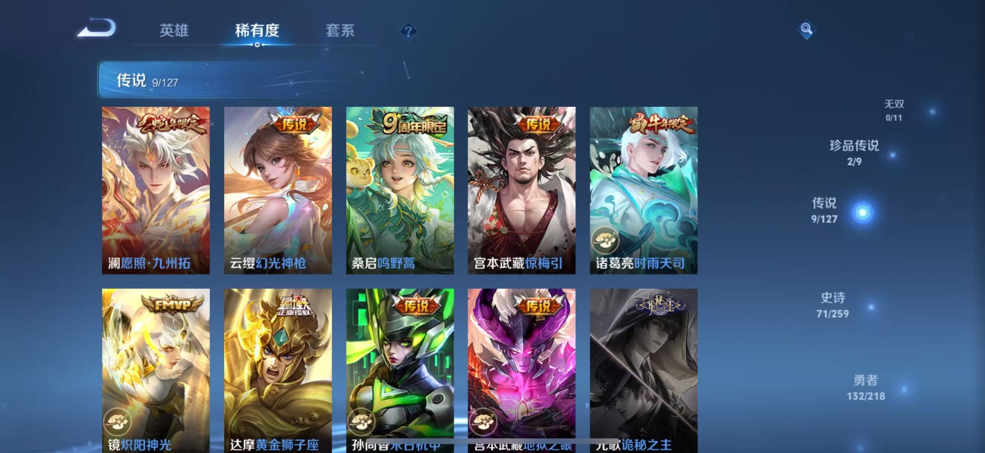 - PX_2071646-贵族等级: V7 英雄数: 124 皮肤数: 219 无双皮: 碎月剑心,器灵·螭龙剑 传说皮: 黄金射手座,云鹰飞将,末日机甲-孙尚香,地狱火,音你心动-周瑜,游龙清影,电玩·雷克斯,霜月吟,澜逐花归海,乘龙·淬吴钩 限定皮: 李小龙,梁祝,神威,凤求凰,孙行者,五谷丰年,怒海麟威,夏侯惇霜北刀,鸣野蒿,愿照·岁时盈