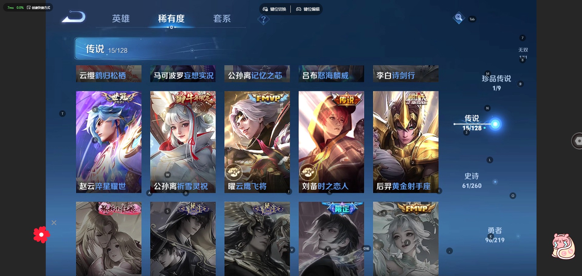 - [11632174]V8 2典藏 14传说 125英雄 325皮肤 可修改实名 优质装备:全息碎影(猴子典藏),幻阙歌(貂蝉典藏),黄金狮子座,云鹰飞将(小将军),炽阳神光,一念神魔,地狱火,零号·赤焰,时之恋人-刘备(电焊工) 传说皮:典韦战鼓燎原,幻光神枪 珍宝阁皮:优雅恋人,女武神 限定皮:鸣野蒿,至尊宝,白虎志(电光耗子),凤求凰(白切鸡),白晶晶,神威(电光马子),飞衡(韩信年限),瑞麟志(木兰年限),遇见飞天,高山流水,冰锋战神,游园惊梦,梁祝,御风骁将(吕布年限),烈魂,天狼绘梦者,李小龙,逐梦之光,朱雀志(守约年限),如梦令-嫦娥,如梦令-后羿,霸王别姬-虞姬,猪悟能,大圣娶亲,引擎之心,天魔缭乱,冰霜恋舞曲,美猴王,寅虎·御盾(廉颇年限) 史诗皮:龙之律动,石田雨龙,东方月初,百相守梦-黄忠,紫霞仙子,黄金分割率,永昼,江河有灵,鹤归松栖(赵怀真),蒙恬荣光圣徽,冰冠公主,晚萤,暗夜猫娘,龙骑士(小龙虾),末日机甲-吕布,猫狗日记-孙策,乱世虎臣,节奏热浪,修罗,女仆咖啡,摇滚巨星,水果甜心,绅士熊喵,天才门将,星夜王子,心灵骇客,功夫厨神,德古拉伯爵,暗隐猎兽者,幽灵船长,鬼剑武藏,心灵战警,舞动绿茵,纤云弄巧,繁星吟游(呼啦呼啦),缤纷独角兽,乘风破浪,逐浪之夏,水晶猎龙者,曙光守护者,箭羽风息,金属风暴,原初追逐者,圣诞狂欢,圣诞恋歌,鹰眼统帅,王者之锤,暗夜贵公子,魅力维加斯,黎明之约,赏金猎手,寅虎·御盾,无心,未来纪元-赵云