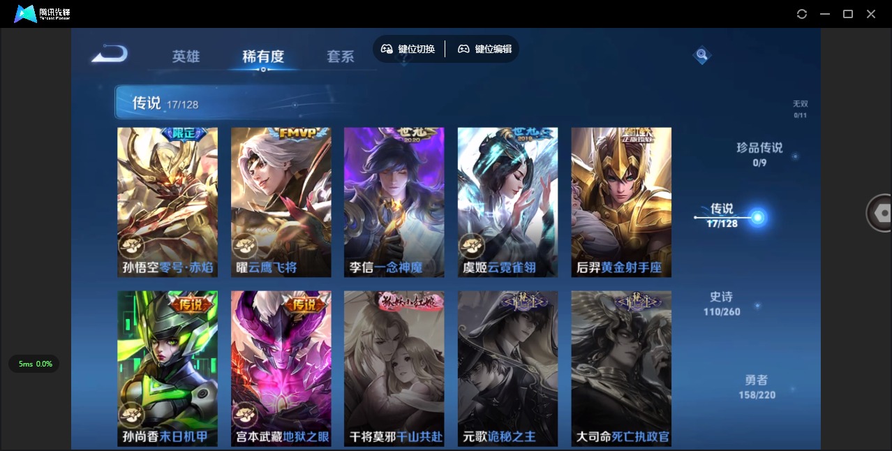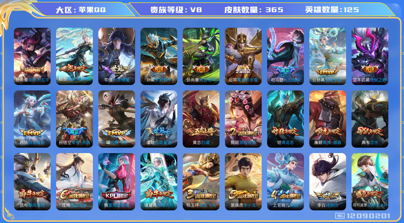 [12090201]V8 1典藏 17传说 125英雄 365皮肤 可修改实名 优质装备:杀手不太冷,黄金射手座,云鹰飞将(小将军),一念神魔,云霓雀翎,末日机甲-孙尚香(绿蚂蚱),零号·赤焰,地狱之眼,游龙清影(小青龙),末日机甲-孙策,涂山容容 传说皮:乘龙·铭钟鼎(赵云年限),九山相柳,云诺千山 珍宝阁皮:妄想食味,优雅恋人,玩趣恶龙 限定皮:鸣野蒿,至尊宝,时雨天司(水龙头),神威(电光马子),飞衡(韩信年限),遇见飞天,高山流水,诗剑行,降魔,五谷丰年,青龙志(铠年限),游园惊梦,梁祝,御风骁将(吕布年限),烈魂,岱宗(典韦年限),李小龙,朱雀志(守约年限),孙行者,猪悟能,大圣娶亲,匿光追影者,寅虎·御盾(廉颇年限),深海之息(深海大菠萝),山海·玄木吟(马可年限) 史诗皮:化蝶舞,星界战将,龙之律动,石田雨龙,百相守梦-周瑜,茶境仙,怒海争锋,琥珀纪元伽罗,蔬乡物语(鲁班七号),百相守梦-黄忠,紫霞仙子,苍穹之光,白龙吟,黄金分割率,特工魅影,千年之狐,江河有灵,雪夜绮愿(周瑜),百解令(蒙犽),高渐离燃音魔法,蒙恬荣光圣徽,青蛇,偶像歌手,晚萤,龙骑士(小龙虾),末日机甲-吕布,猫狗日记-孙策,猫狗日记-大乔,时之恋人-孙尚香,乱世虎臣,节奏热浪,修罗,女仆咖啡,摇滚巨星,水果甜心,绅士熊喵,天才门将,星夜王子,心灵骇客,功夫厨神,德古拉伯爵,暗隐猎兽者,幽灵船长,鬼剑武藏,暗渊魔法,心灵战警,天秀·启明,舞动绿茵,地狱岩魂,纤云弄巧,拒霜思,缤纷独角兽,乘风破浪,逐浪之夏,龙鼓争鸣,月团寄思,水晶猎龙者,曙光守护者,箭羽风息,金属风暴,原初追逐者,圣诞狂欢,圣诞恋歌,鹰眼统帅,暗夜贵公子,魅力维加斯,黎明之约,赏金猎手,寅虎·御盾,无心,未来纪元-赵云