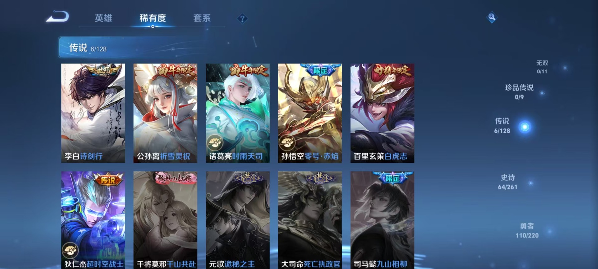 - [11471520]V10 11典藏 37传说 124英雄 253皮肤 典藏英雄武则天 可修改实名 优质装备:天鹅之梦(小乔典藏),星空梦想(太空人),倪克斯神谕(宇宙婆娘),活力突击,杀手不太冷,大秦宣太后,鸣剑·曳影,全息碎影(猴子典藏),星域神启(倪克斯贼亮),九霄神辉(木兰典藏),赤影疾锋,黄金狮子座,黄金射手座,冠军飞将,云鹰飞将(小将军),绛天战甲(鸡嘴战神),黄金白羊座,猫影幻舞,久胜战神,炽阳神光,一念神魔,云霓雀翎,末日机甲-孙尚香(绿蚂蚱),仲夏夜之梦(大飞蛾),零号·赤焰,海洋之心,地狱之眼,胖达荣荣,乞巧织情,时之恋人-刘备(电焊工),淬星耀世,超时空战士-狄仁杰,末日机甲-孙策,碎云,神器·狴犴令,艾琳觅芳踪 珍宝阁皮:妄想食味 限定皮:武陵仙君(小桃花),异界灵契(白毛香),傲雪梅枪,补天,寅虎·展翼(孙膑年限),星穹之声,绯月行,时雨天司(水龙头),五谷丰年,武圣,如梦令-嫦娥,如梦令-后羿,真爱至上,纯白花嫁,孙行者,一生所爱,青春决赛季,匿光追影者,女儿国国王,寅虎·御盾(廉颇年限),寅虎·瑞焰(虎皮蛋子),寅虎·心曲(虎婆),寅虎·赤拳(老虎年限),时之祈愿-云中君,时之祈愿-瑶(瑶传限),百木心枪,玉兔公主,启示之音,匿光启智者,时之奇旅-妲己,神器·万象笔,梦圆繁星 史诗皮:龙之律动,百相守梦-黄忠,紫霞仙子,苍穹之光,电玩小子(小书包),白龙吟,黄金分割率,特工魅影,千年之狐,偶像歌手,龙骑士(小龙虾),暗夜猫娘,魅语,无限星赏官,冰冠公主,末日机甲-吕布,猫狗日记-孙策,猫狗日记-大乔,时之恋人-孙尚香,乱世虎臣,节奏热浪,修罗,女仆咖啡,摇滚巨星,水果甜心,绅士熊喵,天才门将,星夜王子,心灵骇客,时之奇旅-安琪拉,功夫厨神,暗隐猎兽者,幽灵船长,鬼剑武藏,暗渊魔法,心灵战警,乐园奇幻夜,天秀·启明,舞动绿茵,地狱岩魂,缤纷独角兽,乘风破浪,逐浪之夏,龙鼓争鸣,月团寄思,水晶猎龙者,曙光守护者,热力回旋,箭羽风息,唤灵魅影,金属风暴,圣诞狂欢,圣诞恋歌,暗夜贵公子,魅力维加斯,雪上飞焰,寅虎·御盾,无心,未来纪元-赵云
