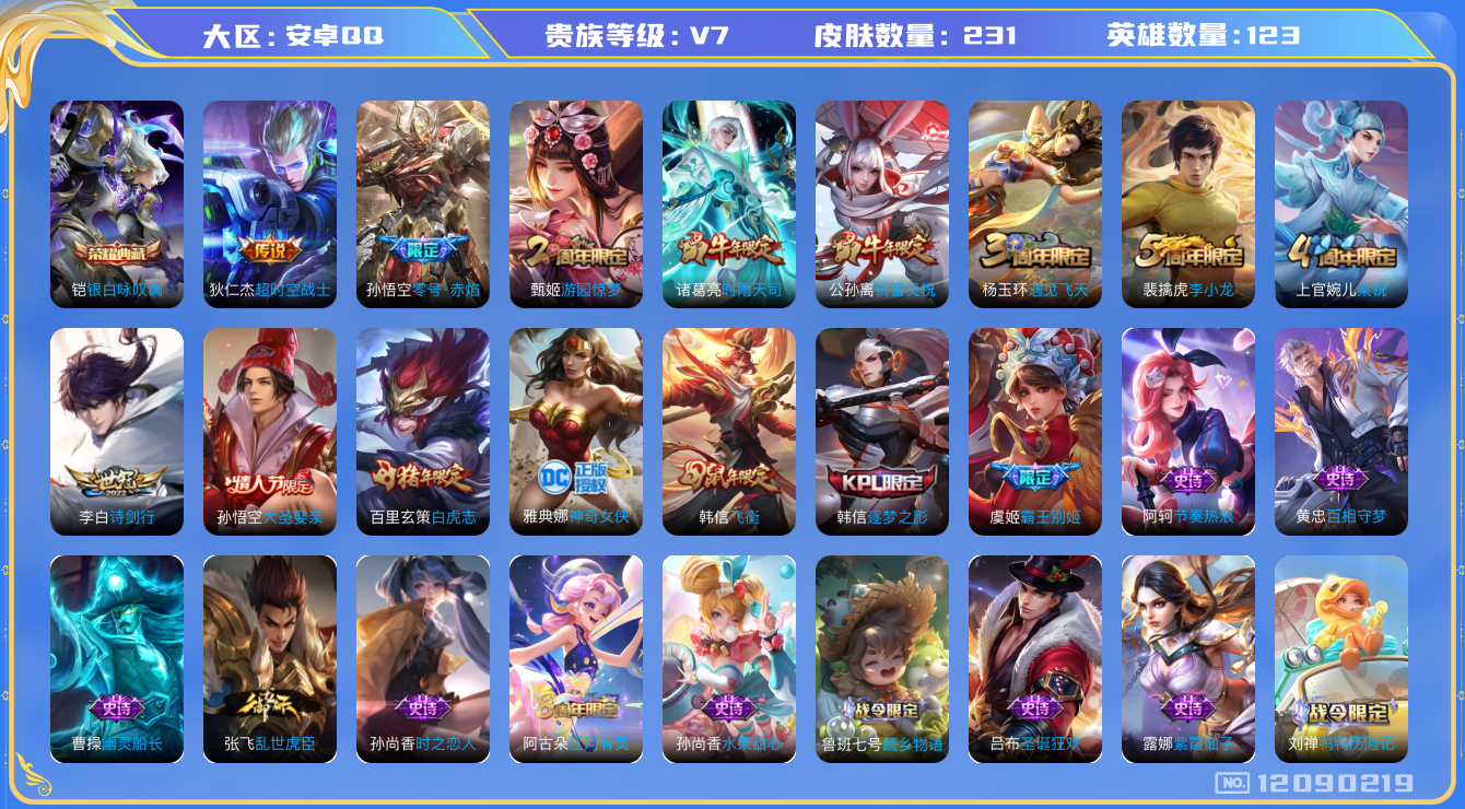 [12090219]V7 1典藏 6传说 123英雄 231皮肤 可修改实名 优质装备:银白咏叹调(倪克斯侍卫),零号·赤焰,超时空战士-狄仁杰 珍宝阁皮:万物之道,蔷薇恋人 限定皮:白虎志(电光耗子),时雨天司(水龙头),飞衡(韩信年限),遇见飞天,诗剑行,游园惊梦,梁祝,祈雪灵祝(雪兔子),李小龙,逐梦之影,霸王别姬-虞姬,大圣娶亲,神奇女侠 史诗皮:鸭鸭历险记-刘禅,龙之律动,蔬乡物语(鲁班七号),百相守梦-黄忠,织梦人,紫霞仙子,白龙吟,特工魅影,江河有灵,蒙恬荣光圣徽,冰冠公主,偶像歌手,晚萤,龙骑士(小龙虾),时之恋人-孙尚香,乱世虎臣,节奏热浪,女仆咖啡,摇滚巨星,水果甜心,心灵骇客,暗隐猎兽者,幽灵船长,鬼剑武藏,乐园奇幻夜,天秀·启明,纤云弄巧,繁星吟游(呼啦呼啦),逐浪之夏,水晶猎龙者,热力回旋,金属风暴,原初追逐者,圣诞狂欢,圣诞恋歌,鹰眼统帅,魅力维加斯,黎明之约,赏金猎手,无心,未来纪元-赵云