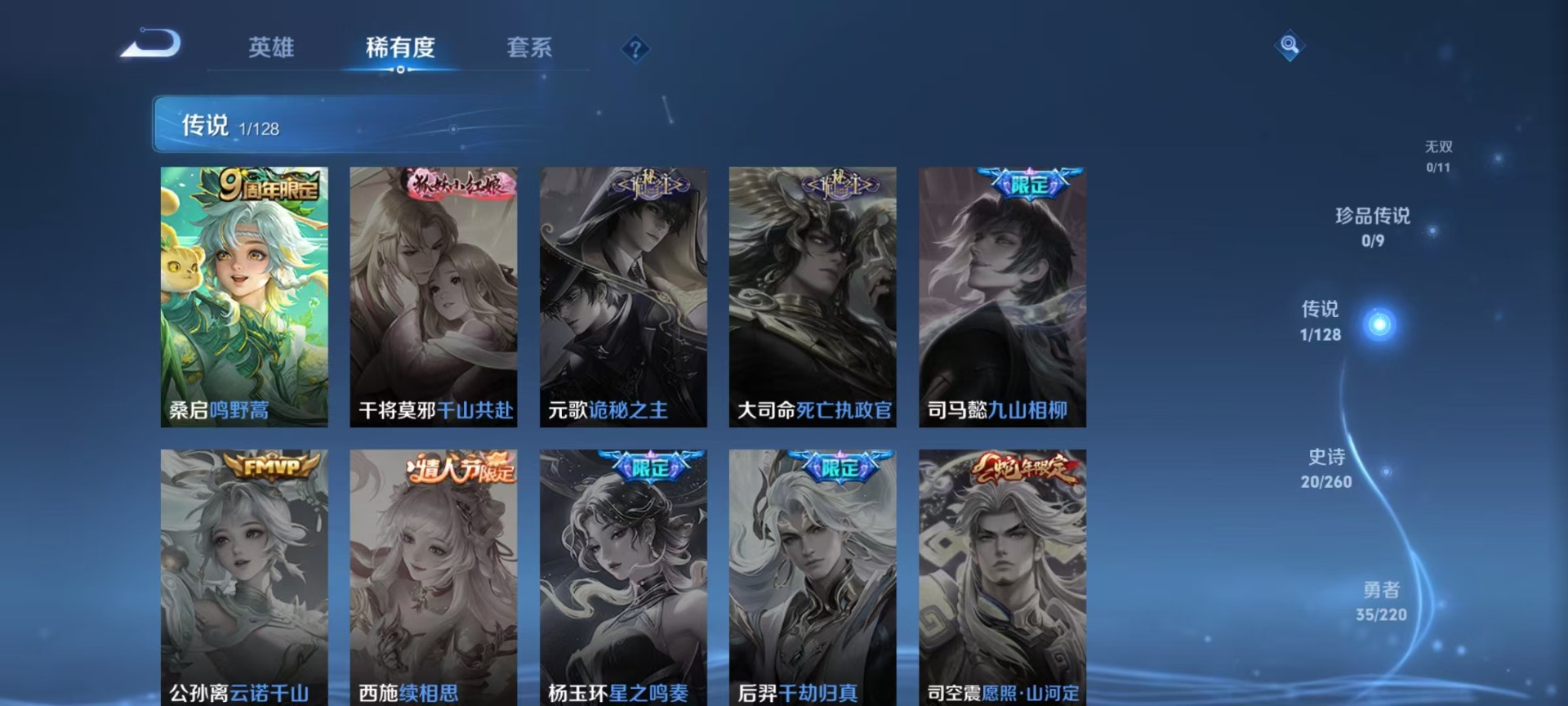 - [11228431]V8 1典藏 2珍品传说 14传说 123英雄 278皮肤 可修改实名 荣耀水晶:鸣剑·曳影 珍品传说:怪盗基德,时之奇旅-孙策 传说皮:幻光神枪,黄金狮子座,黄金白羊座,一念神魔,云鹰飞将(小将军),无双飞将,时之恋人-刘备(电焊工),挚爱之约 珍宝阁皮:妄想食味,优雅恋人,玩趣恶龙 限定皮:愿照·九州拓(澜年限),愿照·山河定(司空震年限),愿照·千秋盛(女娲年限),逐霄战戟,白虎志(电光耗子),武陵仙君(小桃花),傲雪梅枪,神威(电光马子),飞衡(韩信年限),高山流水,五谷丰年,冰锋战神,李小龙,孙行者,猪悟能,大圣娶亲,云端筑梦师 史诗皮:茶境仙,苍鳞隐世,器灵·浮梦炉,百相守梦-百里守约,化蝶舞,遇见神鹿,紫霞仙子,苍穹之光,电玩小子(小书包),白龙吟,黄金分割率,特工魅影,江河有灵,百解令(蒙犽),蒙恬荣光圣徽,冰冠公主,偶像歌手,电玩·爆裂旋风,百相守梦(关羽),龙骑士(小龙虾),末日机甲-吕布,猫狗日记-孙策,猫狗日记-大乔,节奏热浪,修罗,女仆咖啡,摇滚巨星,水果甜心,天才门将,心灵骇客,时之奇旅-安琪拉,功夫厨神,德古拉伯爵,暗隐猎兽者,幽灵船长,鬼剑武藏,心灵战警,乐园奇幻夜,天秀·启明,舞动绿茵,地狱岩魂,纤云弄巧,拒霜思,缤纷独角兽,乘风破浪,逐浪之夏,月团寄思,水晶猎龙者,曙光守护者,金属风暴,原初追逐者,圣诞狂欢,圣诞恋歌,鹰眼统帅,魅力维加斯,黎明之约,赏金猎手,无心,未来纪元-赵云