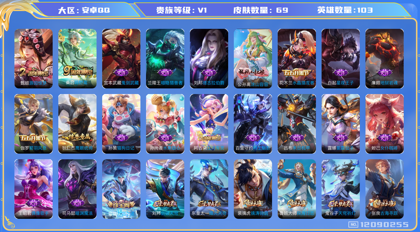 [12090255]V1 1传说 103英雄 69皮肤 可修改实名 优质装备:涂山容容 珍宝阁皮:万物之道 限定皮:鸣野蒿,游园惊梦 史诗皮:紫霞仙子,特工魅影,江河有灵,偶像歌手,末日机甲-吕布,猫狗日记-孙策,女仆咖啡,水果甜心,星夜王子,德古拉伯爵,暗隐猎兽者,鬼剑武藏,暗渊魔法,地狱岩魂,水晶猎龙者,箭羽风息,鹰眼统帅