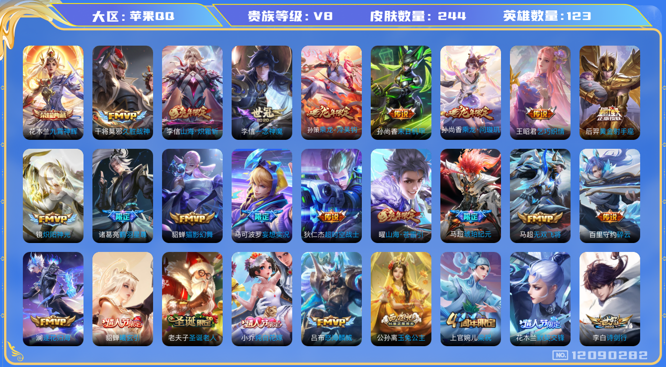 [12090282]V8 1典藏 25传说 123英雄 244皮肤 可修改实名 优质装备:九霄神辉(木兰典藏),黄金射手座,猫影幻舞,久胜战神,炽阳神光,一念神魔,末日机甲-孙尚香(绿蚂蚱),乞巧织情,超时空战士-狄仁杰,无双飞将,碎云,山海·炽霜斩(李信年限),山海·苍雷引(电光曜子),鹤羽星尊,妄想实况,澜逐花归海,琥珀纪元马超 传说皮:乘龙·问璇玑(孙尚香年限),乘龙·淬吴钩(孙策年限),貂蝉曦玄引 珍宝阁皮:妄想食味,胡桃夹子 限定皮:鸣野蒿,至尊宝,傲雪梅枪,补天,神威(电光马子),瑞麟志(木兰年限),诗剑行,齐天大圣,怒海麟威,降魔,五谷丰年,梁祝,朱雀志(守约年限),圣诞老人,默契交锋-花木兰,纯白花嫁,孙行者,玉兔公主,山海·玄木吟(马可年限),冰霜神祇 史诗皮:星界战将,破空之剑,百相守梦-黄忠,紫霞仙子,特工魅影,江河有灵,浮梦罗烟,魅语,百解令(蒙犽),高渐离燃音魔法,蒙恬荣光圣徽,匿光破解者,偶像歌手,晚萤,电玩·爆裂旋风,百相守梦(关羽),末日机甲-吕布,猫狗日记-大乔,乱世虎臣,节奏热浪,女仆咖啡,水果甜心,星夜王子,功夫厨神,德古拉伯爵,暗隐猎兽者,幽灵船长,鬼剑武藏,心灵战警,地狱岩魂,纤云弄巧,缤纷独角兽,乘风破浪,逐浪之夏,水晶猎龙者,曙光守护者,箭羽风息,唤灵魅影,金属风暴,原初追逐者,圣诞狂欢,鹰眼统帅,魅力维加斯,黎明之约,赏金猎手,无心,未来纪元-赵云